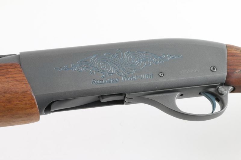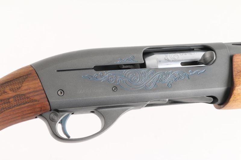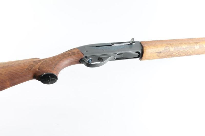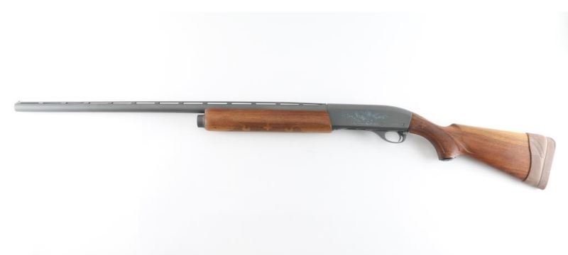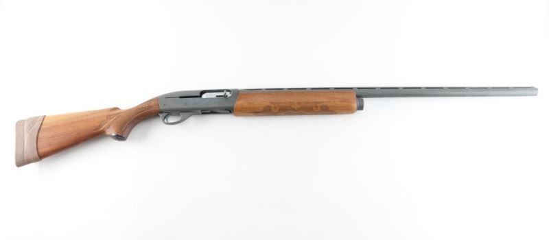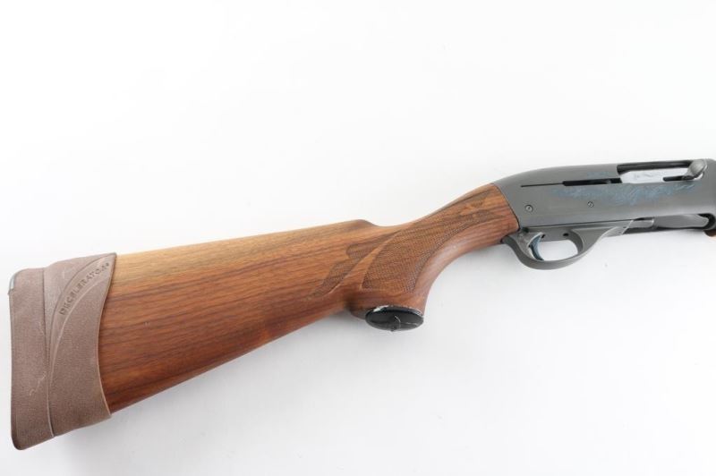 American made gas operated semi-automatic shotgun chambered for 3" 12 gauge Magnum shells. Features a 30" fixed full choke vent rib barrel with a silver bead front sight, 1/3 length tube magazine, simple floral scroll roll-stamp engraving on the receiver & bolt, smooth trigger with beveled edges, alloy trigger guard, serrated charging handle, push button safety, fancy press checkered walnut forend and pistol grip shoulder stock with checkering at wrist with flying duck grip cap and "KICK-EEZ" recoil pad. LOP is 15". Bore looks Very Good. Barrel and receiver have been refinished with what appears to be a very nice greenish/grey Cerakote. The scroll work has been filled with a bluish color. Wood looks good but the grip cap is the wrong one for this gun and who ever glued it on did sloppy work.