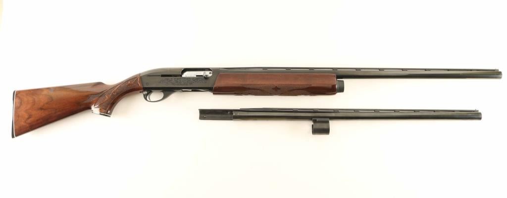 Shotgun, Semi-auto, gas operated. Produced 1963-present. Chrome bolt. 4 rd tube magazine. 2 3/4" chamber. Blued metal finish, with checkered wood stock, and forearm. Black plastic butt pate, and grip cap, with white spacers. 28" barrel with ventilated rib, and sighting bead. Bore appears excellent/bright, but a little dusty. Action is crisp/tight. Blued finish is about 96% with wear to the muzzle, minor scratches, and a couple of dings to the top left receiver. Not Bad. Wood is very good, with some minor scratches, and a couple of small dents on the right forearm, and bottom stock. Overall a very nice conditioned shotgun. Comes with an extra 24" ventilated ribbed barrel. Blued finish, which is excellent. Bore is good except for some surface rust in the lower portion. Should clean up. NRA Condition-Very Good. Modern Firearm.