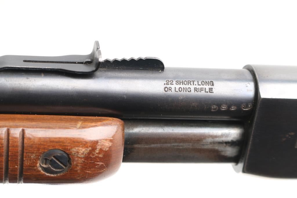 'The Field Master' Take down pump action rimfire rifle manufactured circa 1947. Features blued finish, grooved walnut pump handle, smooth walnut stock with curved grip, factory checkered metal buttplate, 24" barrel, blade front sight with bead top, adjustable sporting rear sight, tube magazine under barrel, manual safety, takedown screw at receiver. Bore is excellent/bright condition. Retains 80% original blue, with edge losses, rubbing wear from operating the action, bare metal on rear portion of magazine, there is a couple of very light spots of pitting on the left receiver. Wood is very good condition with dents & scratches, some finish losses on the buttstock. Action is smooth.