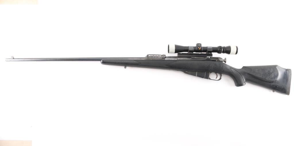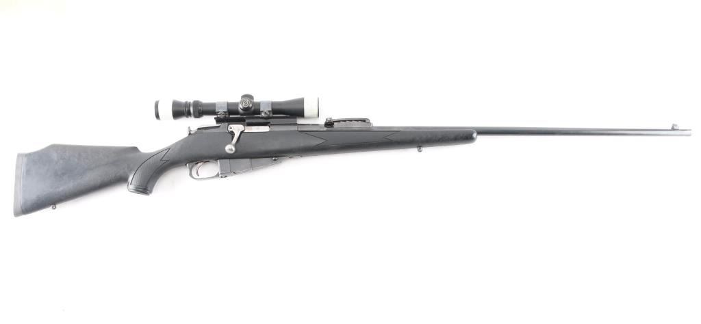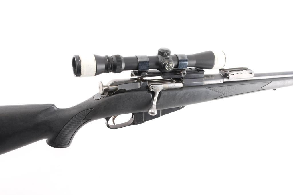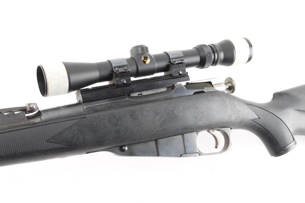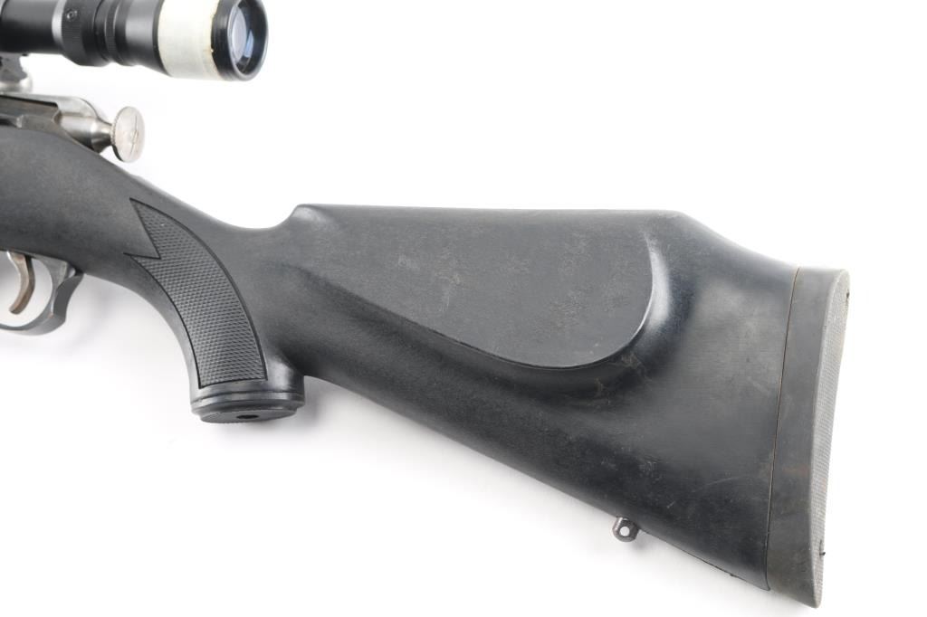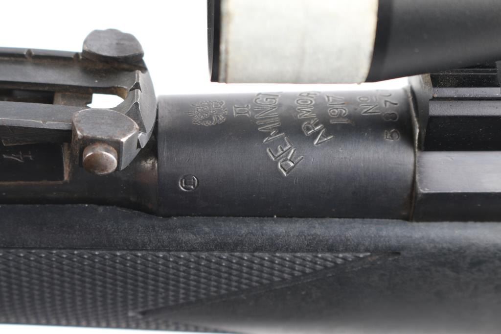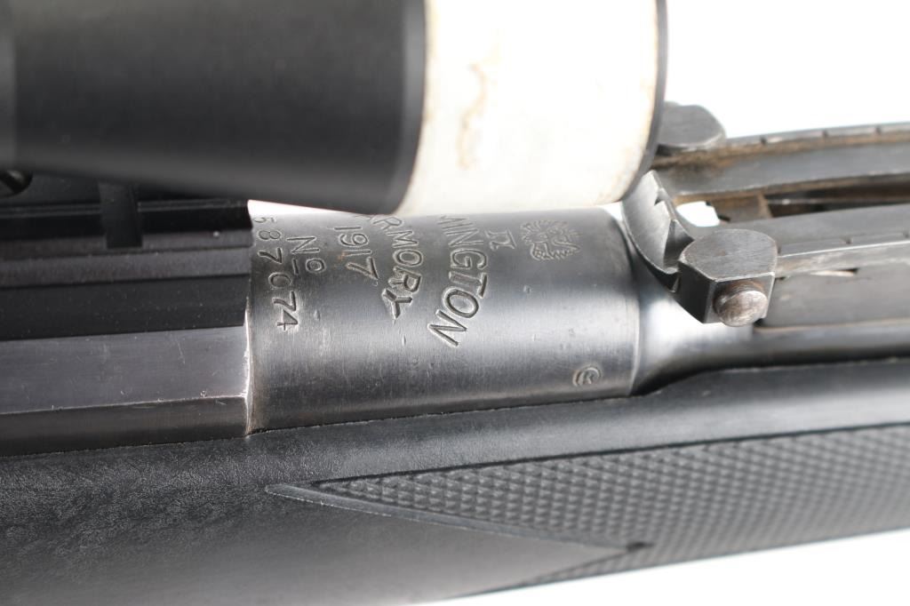 #587074. This is a sporterized Remington M1891. These rifles were made by Remington during WWI under contract for Imperial Russia, and the contract fell through after the Bolshevik Revolution. This example is dated 1917, hex receiver with the serial number matched on the chamber, bolt and floorplate. Features 31.5" barrel, blade front & tangent rear sights. The original stock has been removed and replaced with a black synthetic sporter stock with sling studs, checkered wrist & forearm, rubber recoil pad and right handed cheek rest, the bolt has been modified by removing the straight bolt handle and a down turned, swept back handle that is attached to the bolt with a hex nut. The Bore is fair to good with good rifling, dark frosting in the grooves. Retains full coverage of dark bluing, with some dulling. Polished bolt assembly is very good. Markings are crisp. New stock is very good.Condition is NRA Good. (as modified) C&R Firearm.