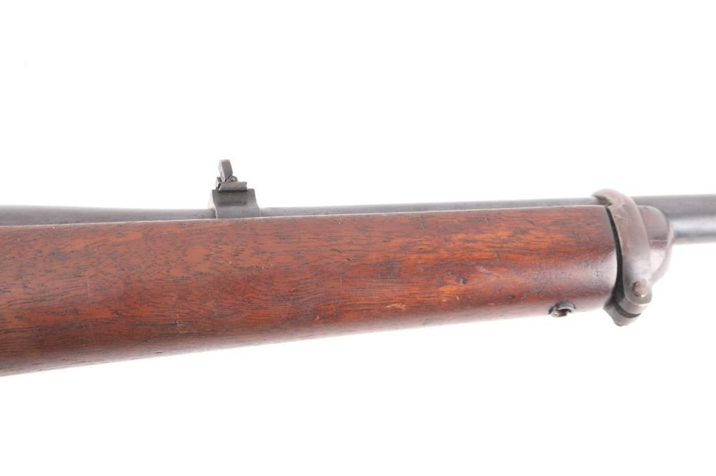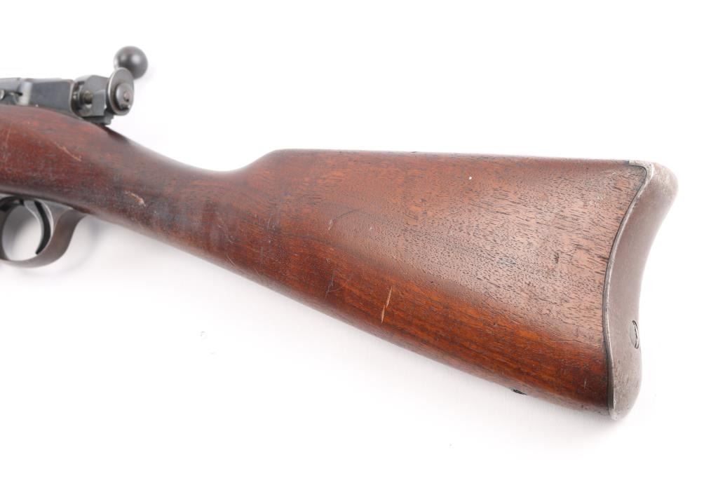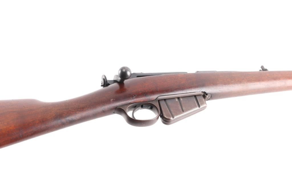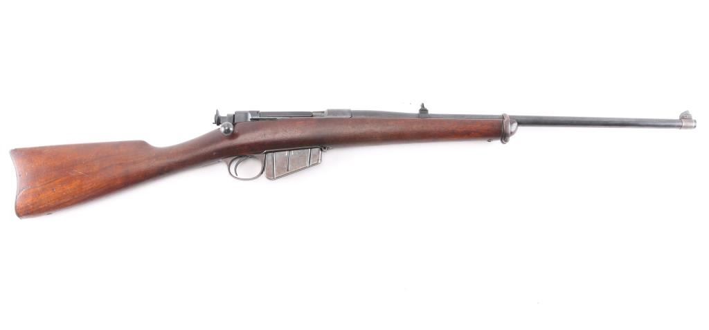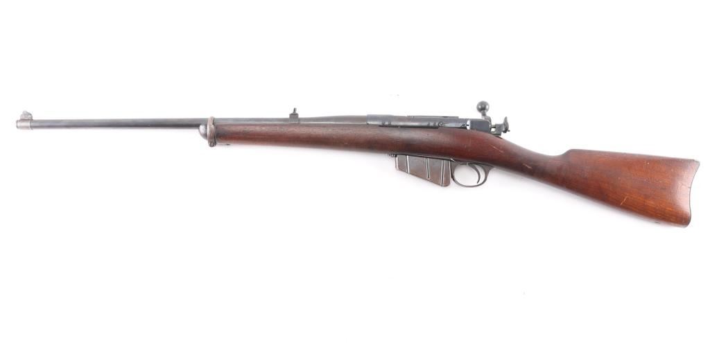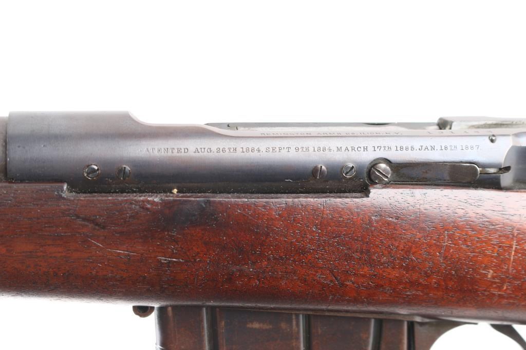 Remington-Lee 1899 sporting rifle. Less than 1500 were sold on the commercial market. The left side of the receiver near the bolt is stamped "REMINGTON ARMS CO. | LION, N.Y.U.S.A 101453". Below that is stamped. "PATENTED AUG.26th 1884. SEPT 9TH 1884. MARCH 17TH 1885. JAN.18TH 1887". 23" barrel, marked "30 U.S.A." pinned front blade, adjustable, flip u notch rear sights. detachable magazine, left receiver drilled/tapped for sights/optics. Smooth straight wrist shoulder stock with provisions for sling swivels, steel buttplate. Bore is good/bright, strong rifling, light frosting in the grooves, wood is very good/sound with minor scratches/scuffs, action is smooth, blue finish is mostly there, dull from age, handling wear on the bottom metal & magazine. Manufactured 1899-1905. Rare rifle.NRA Condition-Near Very Good. C&R Firearm