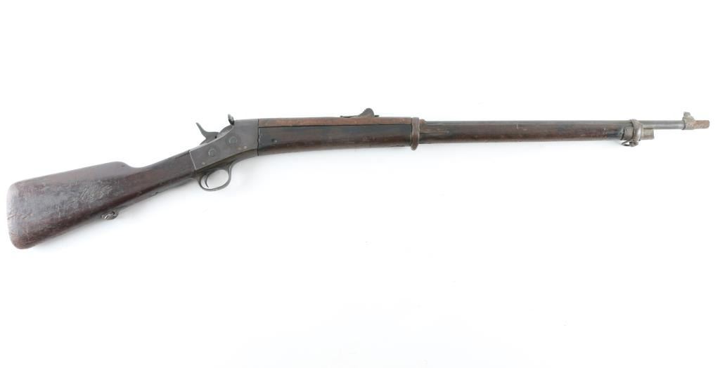Features 30" barrel with two bands, provision for cleaning rod (rod missing), bayonet lug, blade front & tangent rear sight, sling swivels. Middle swivel missing . Tang marked with Remington Address, Patent date. Bore Appears good with rifling present, action is smooth/tight. Blued finish has turned a mostly gray/brown patina with scattered pitting/rust spots. Wood is poor with numerous dents/scratches, missing buttplate. The handguard is cracked in half and glued together. There is also a chip out of the upper handguard.. A large "26" in black paint is on the left buttstock. NRA Condition-Fair. C&R firearm.