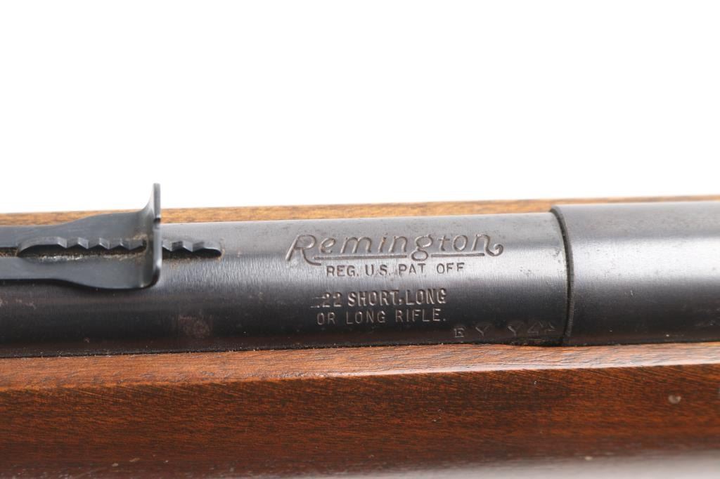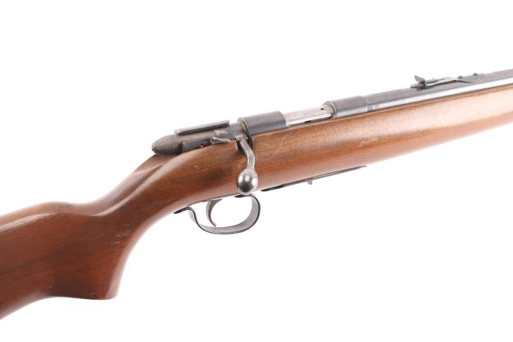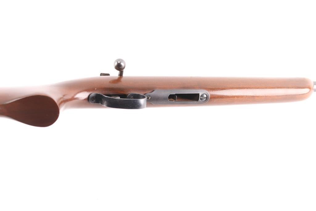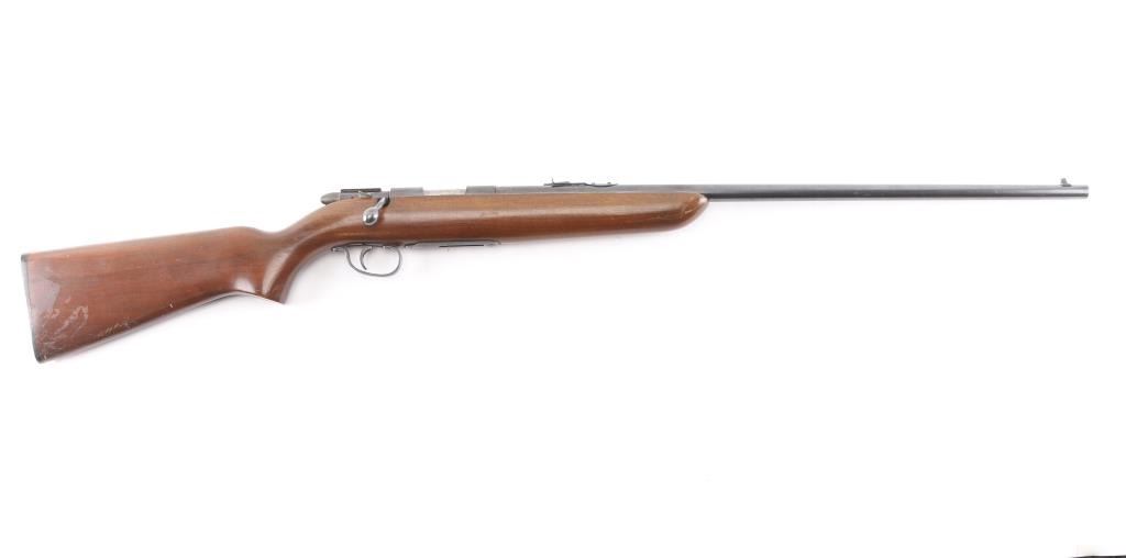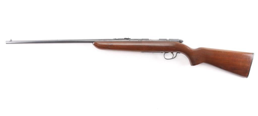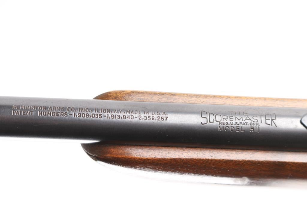 'The Scoremaster' 511 is an American made, magazine fed bolt action sporting rifle chambered for .22 Short, Long or Long Rifle Manufactured 1952. Features a blued finish, 24" barrel, dovetailed blade/bead front sight, elevation adjustable rear sporting sight, serrated trigger, metal trigger guard, manual safety on the right side of the receiver, cocked indicator, and smooth walnut pistol grip shoulder stock , factory buttplate. Bore is excellent/bright. Original blue finish is about 98% with very minor scratches. The wood stock is good/sound with some minor scratches/dings, there is some discoloration on the right buttstock