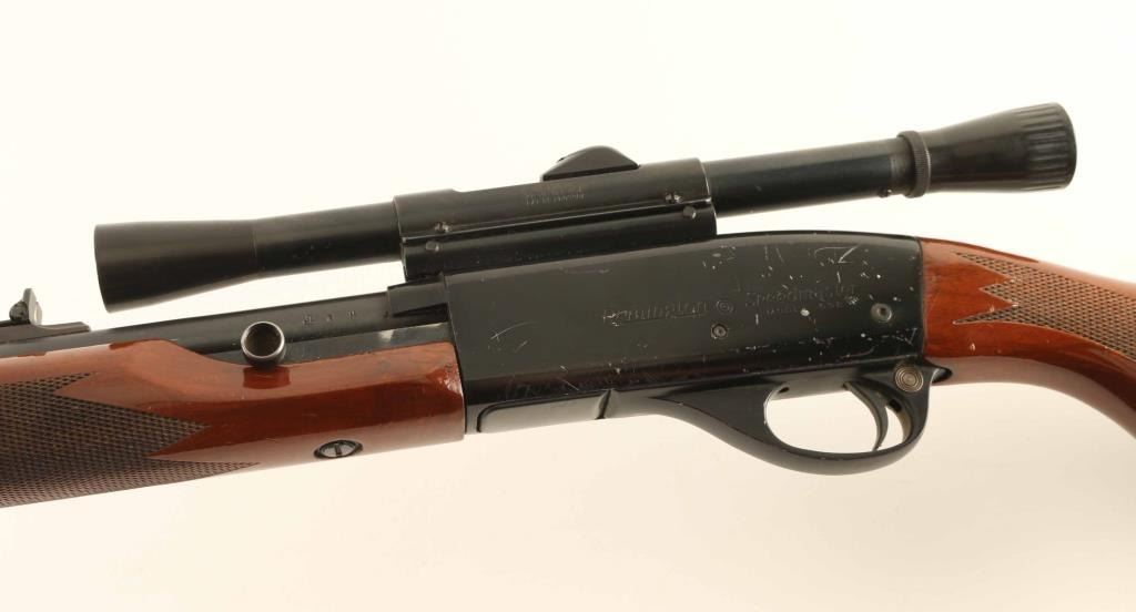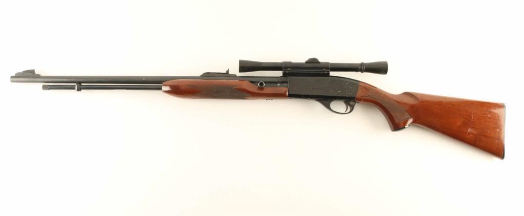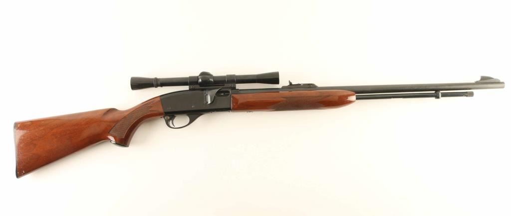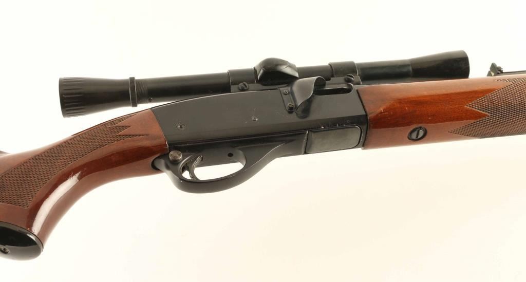 Semiautomatic rimfire rifle features blued finish on steel parts, matching black color finish on alloy receiver, urethane finish on wood, 23" barrel, buckhorn type sights, tube magazine under barrel, manual safety, checkered forend, checkered wrist panels on pistol grip, plastic buttplate. Bore is excellent. Retains 80% finish with bare metal showing at scratches on receiver, dings on barrel. Stock is very good with scratches and dents on butt. Includes good condition Weaver C6 scope with fine crosshairs and clear view. Condition is NRA Good ++ *** C&R Firearm ***