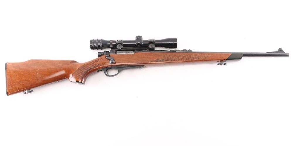 The Remington Model 660 is a push feed, bolt-action rifle manufactured by Remington Arms from 1968 to 1971. The rifle was intended as a replacement for the Model 600 but itself was replaced by the Mohawk-600. This gun has a 20" blued barrel with raised post/bead front sight, rear sight removed, base still in place. Chambered in 6mm Rem. The wood stock has swivel studs, swivels and a blind mag well with checkering at the wrist and forend. Stock is blond/walnut colored. Factory recoil pad, contrasting ebony fore tip and grip cap with white spacer. "Dog Leg" bolt handle. Mounted with a Universal UE 4X32 scope. The barrel and receiver look good with only a small amount of wear showing on the barrel. The bore appears excellent/bright. A few minor scratches on the wood.