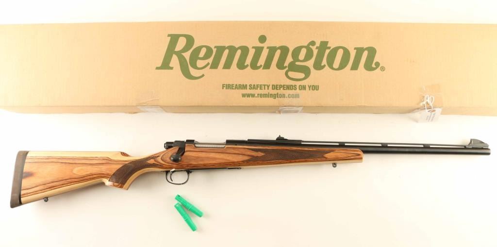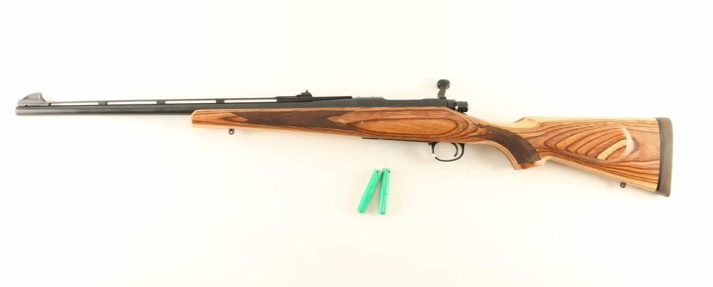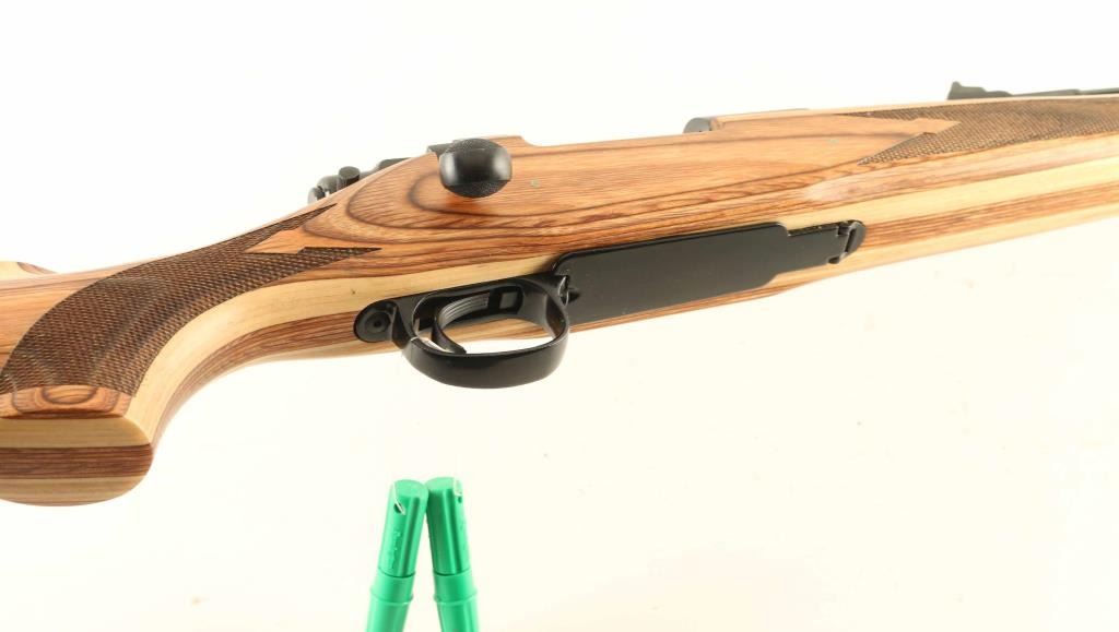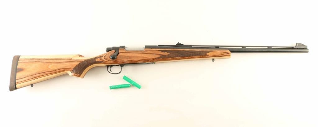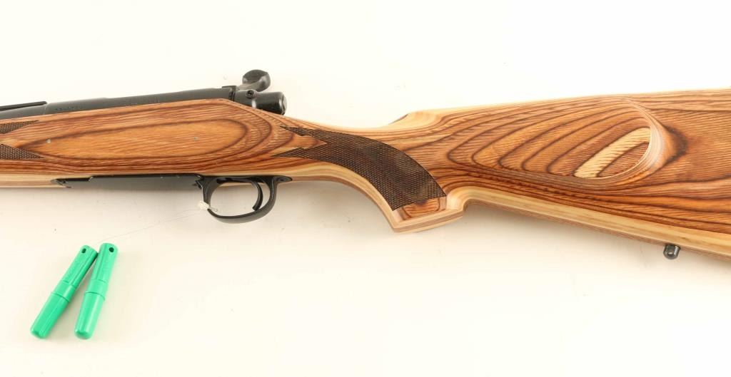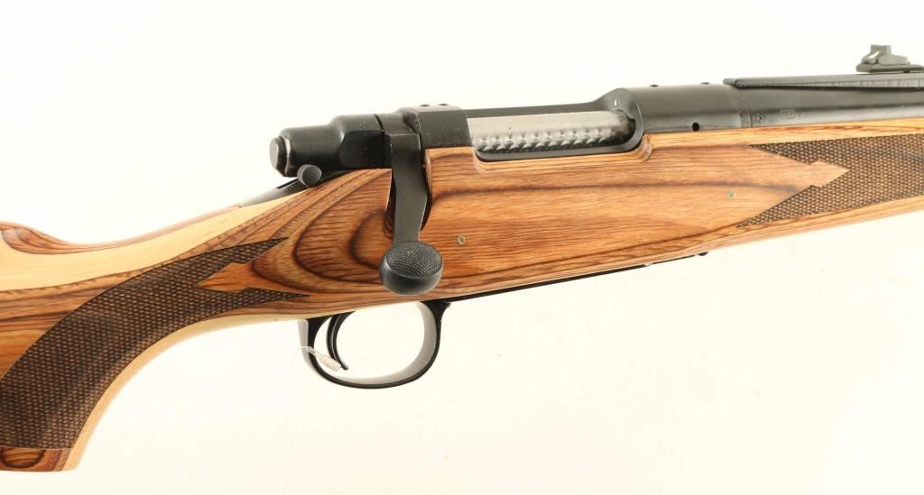 ‘Guide Rifle’ Bolt action sporting rifle chambered in .350 Remington Magnum, manufactured circa 2003-2004. Features a blued finish, 22” tapered barrel with recessed crown & ventilated sighting rib, large blade front sight, adjustable rear sight, serrated wide trigger, jeweled bolt, manual safety on the right side of the receiver, key lock safety on the rear of the bolt (keys included), internal box magazine with hinged floorplate, and checkered light/dark laminated wood semi-pistol grip shoulder stock with swivel studs, factory recoil pad & 13 5/8” LOP. Includes the original factory cardboard box with manual and two safety keys. Rifle retains approximately 99% of its original blued finish showing very little wear. Action is smooth, the bore is excellent, and the wood stock is fine. Condition is NRA Excellent. ***Modern Firearm***