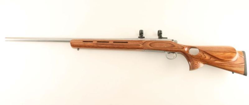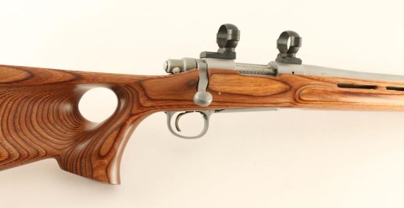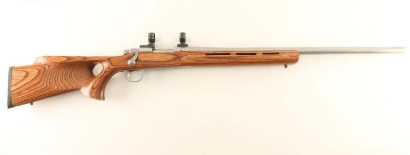'VLSS Thumbhole' Stainless steel bolt action sporting rifle chambered in .223 Remington. Matte finish, 26" bull barrel, installed quick release bases with rings, hinged floorplate, adjustable trigger, jeweled bolt, manual safety and brown laminated wood thumbhole pistol grip shoulder stock with beavertail ventilated forend, swivel studs, right handed cheek rest, & Boyds recoil pad. Rifle exhibits some minor handling marks with no major wear observed. Action is super smooth, bore is excellent and wood stock is near fine with a couple small imperfections. Condition is near new. ***Modern Firearm***