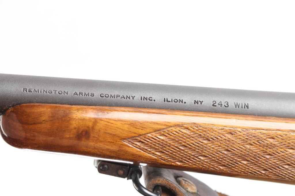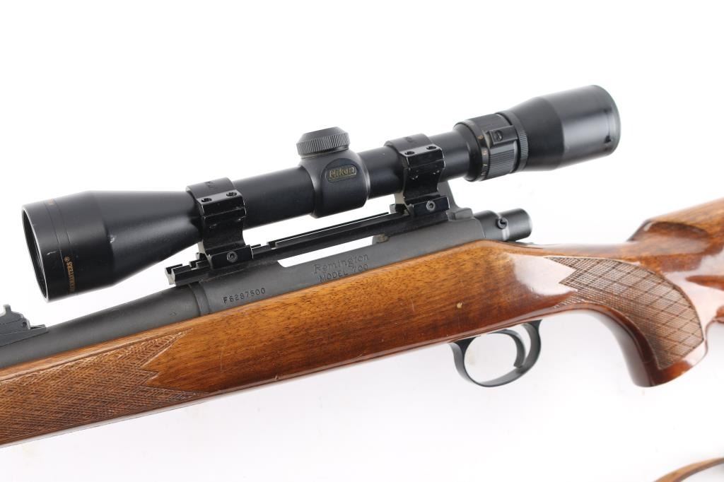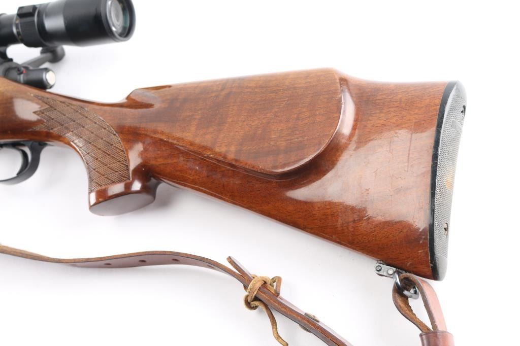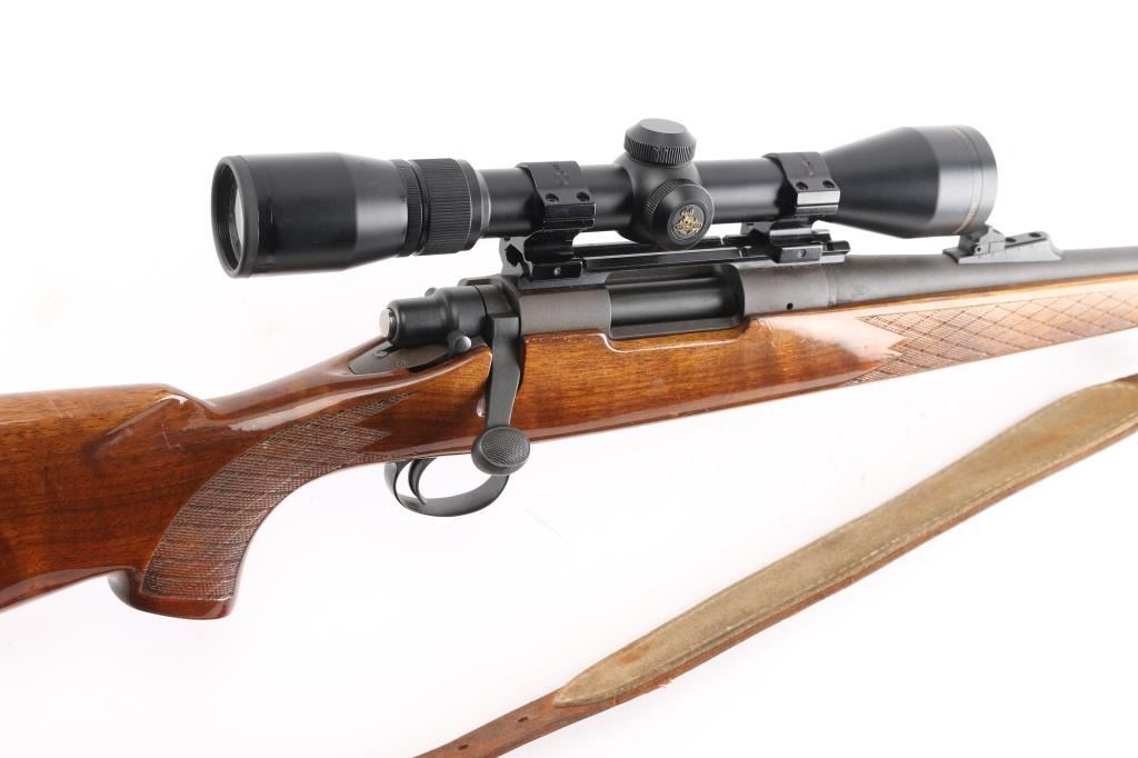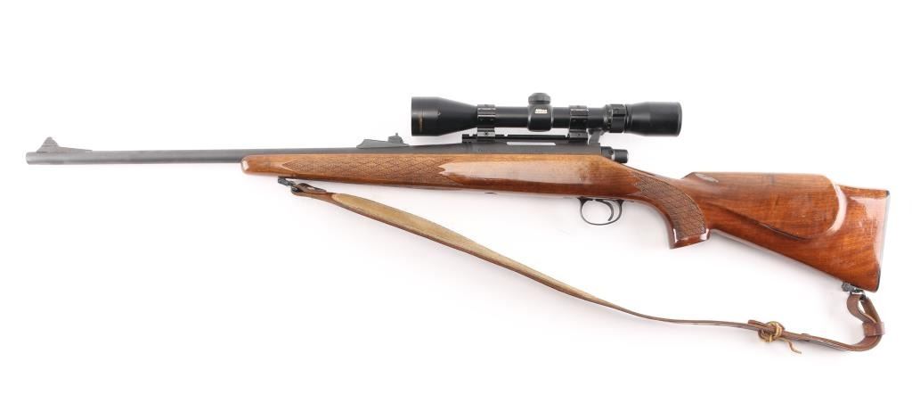 "ADL" Older bolt action sporting rifle, dated 1973. Features parkerized finish, 22" barrel, ramped front blade/bead sight, adjustable notch rear sight one piece Kwik site base and rings, Nikon 'Buckmaster' 3-9X40 scope with fine crosshairs, manual safety, blind magazine, right hand cheek piece, factory buttplate. Bore is very good/bright. Finish is excellent, high gloss stock is very good with some minor scratches/dents. Mechanically sound. Brown leather basket weave sling attached.