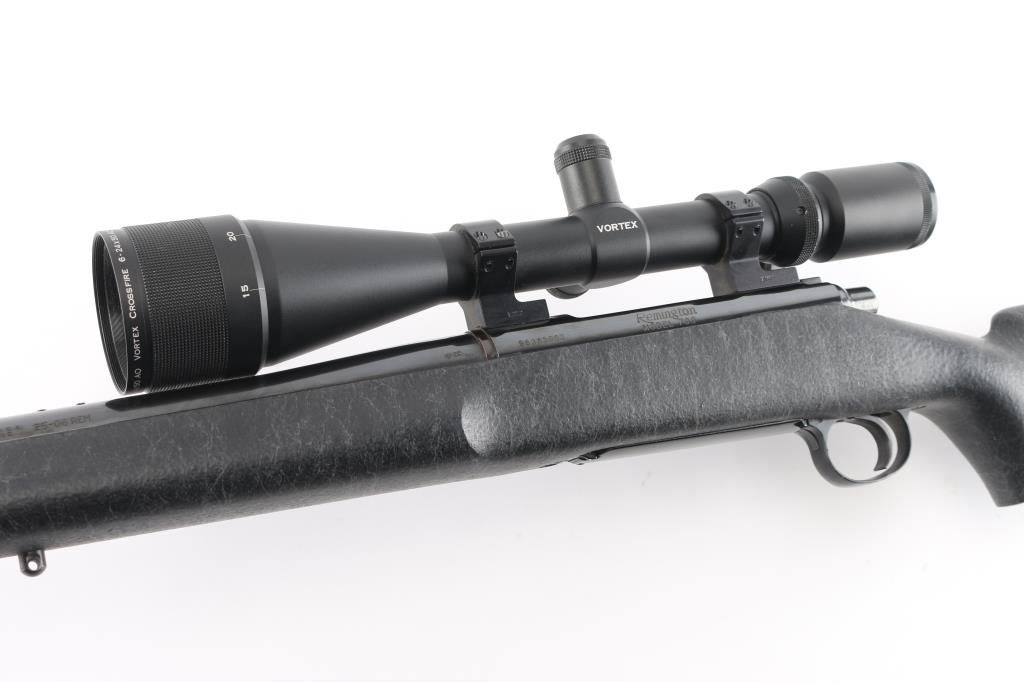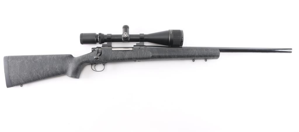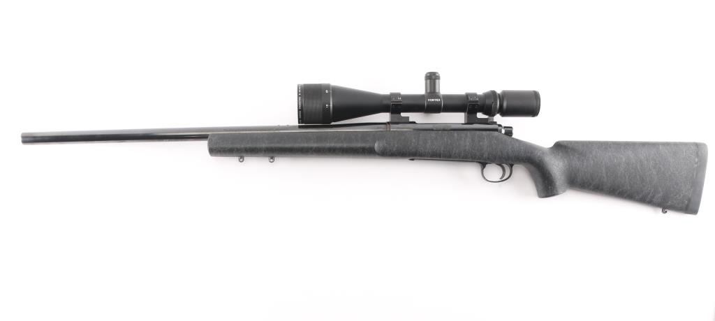 Bolt action sporting rifle features blued steel construction, H-S precision stock features a tactical forend with an enlarged ambidextrous palm swell and full-length aluminum bedding block, dual front swivel studs. 24" heavy barrel, hinged floorplate, manual safety, sling studs, jeweled bolt, serrated trigger, manual thumb safety, solid rubber H-S Precision marked recoil pad, Talley two piece bases with rings, Vortex Crossfire 6-24x50 AO scope with Mil-Dot reticle, clear optics. Bore is excellent/bright. High polish blued finish is near excellent with few small blemishes. Action is smooth.Condition is NRA Excellent. Modern Firearm.