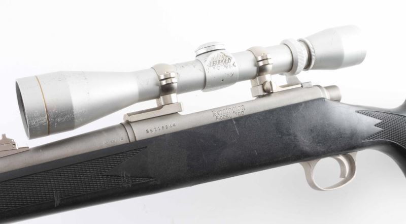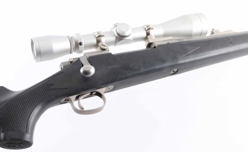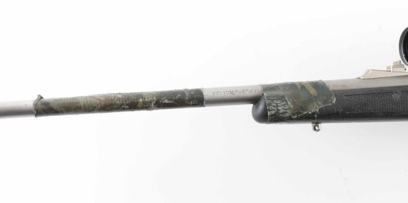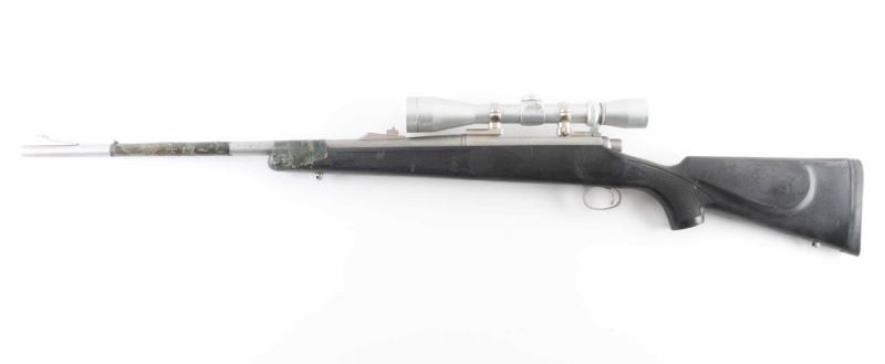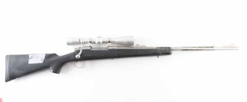 Modern Push feed, bolt action rifle chambered in 338 Win. Mag. The 24" satin finish, stainless barrel has a raised front sight and adjustable ramped rear sight. It is also drilled, tapped and comes with a Leupold 3-9 VARI-X II scope. The black synthetic Monte Carlo stock has a rubber recoil pad, swivel studs checkering at the wrist and forend with a blind magazine. This gun has had camo tape wrapped around the mid-way point on the barrel and around the barrel and forend. (See Photos) There was also tape stuck to the scope at some point because residue is left on the scope. Bore and rifling look great. Wrench for the scope rings is duct tapped to the left side of the stock. NRA Good Modern Firearm