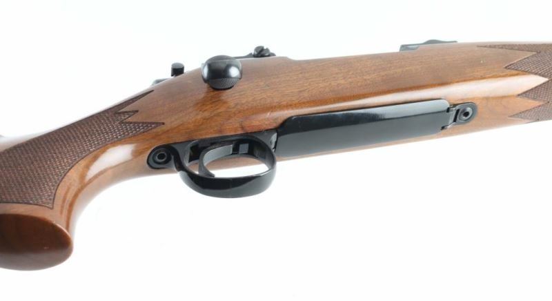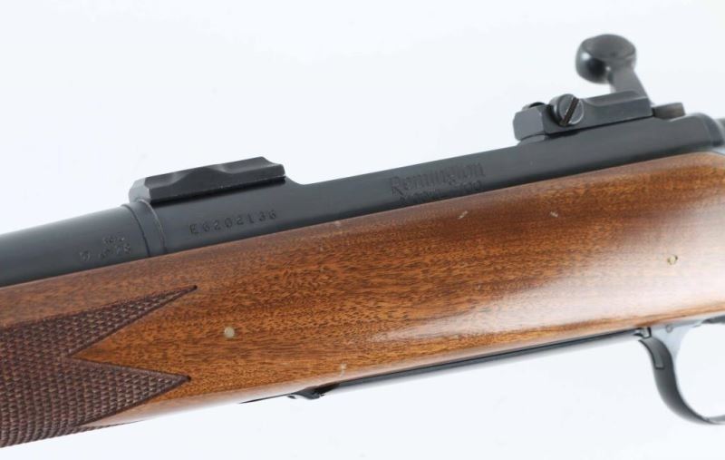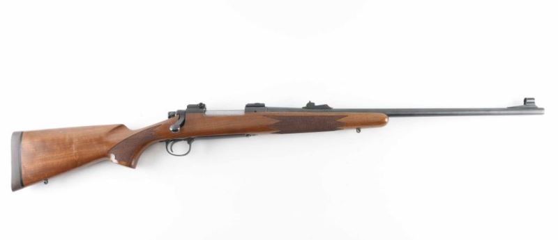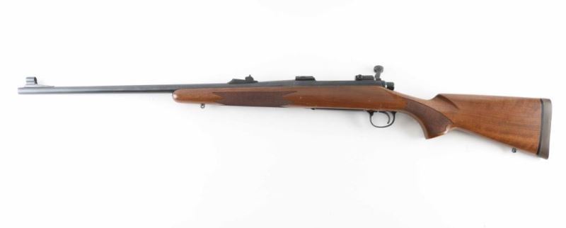 Modern push feed bolt action rifle chambered in .375 H&H Magnum. Matte blued finish on barrel and receiver looks good. Rifle has a hooded front sight and adjustable ramped rear sight with installed Leupold type scope bases. Stock is overall in good shape with some signs of wear, and checkering at the wrist and wrap around checkering at the forend with with a Remington recoil pad. Hinged floorplate and jeweled bolt. NRA Very Good Modern Firearm