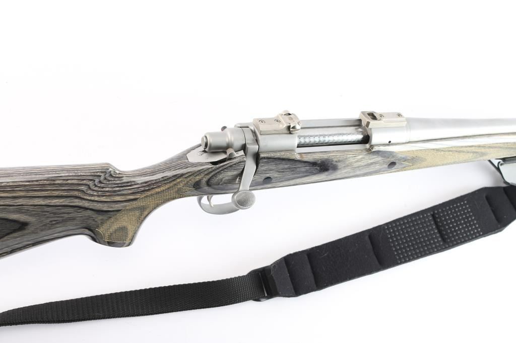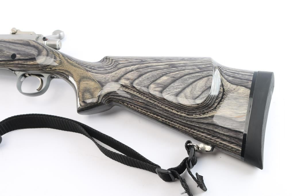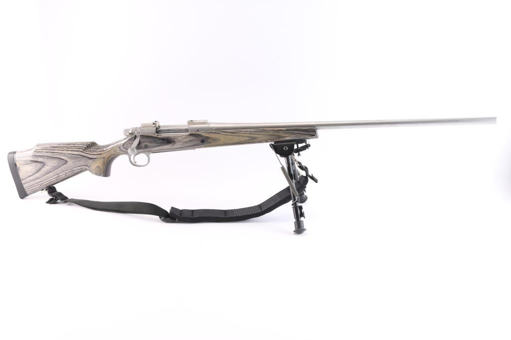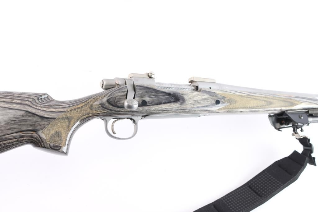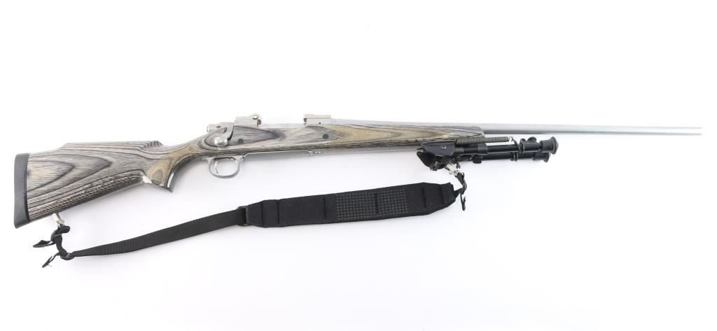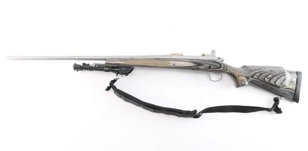 Bolt action rifle chambered in 7mm Remington Ultra Magnum ammunition. Features a satin-finish, 26" tapered barrel, no provision for sights, high gloss wood stock with checkered wrist and forearm, right hand cheek piece, checkered rubber recoil pad, sling swivel studs, Redfield scope bases installed, jeweled bolt with knurled knob, hinged floorplate, manual safety Bore is pristine. Retains approx. 98% finish with slight edge loss on trigger guard. Comes with Harris bipod and Butler Creek padded sling. Condition is NRA excellent. *** Modern Firearm ***