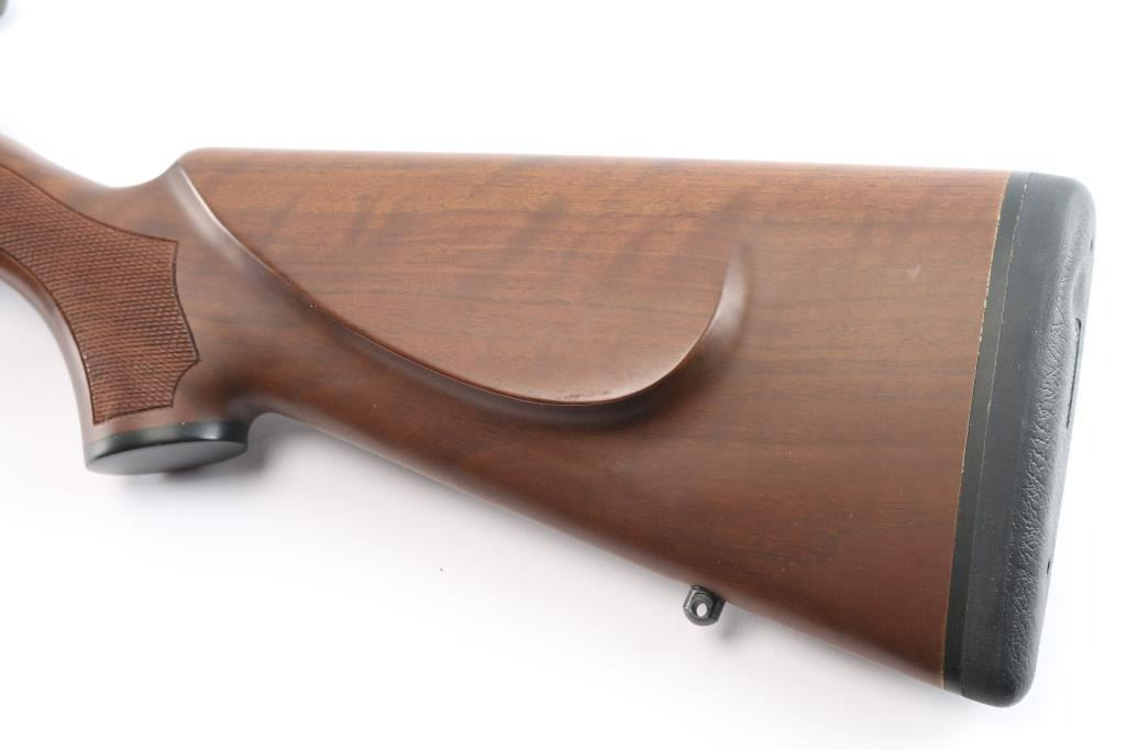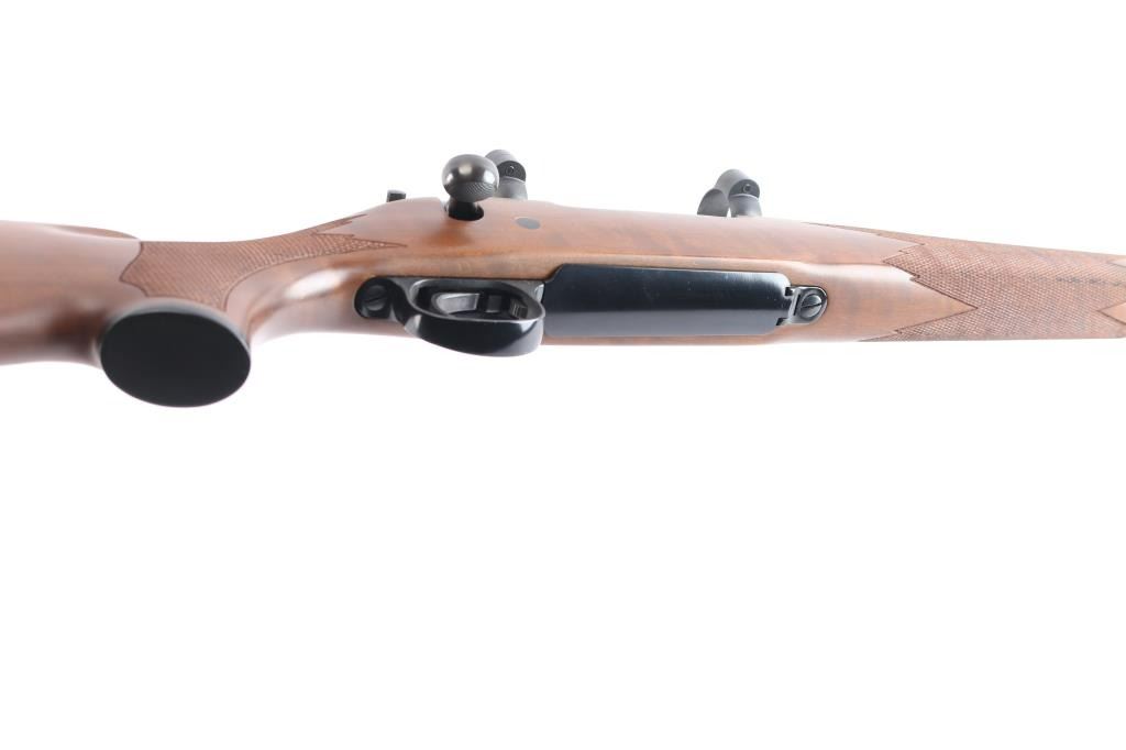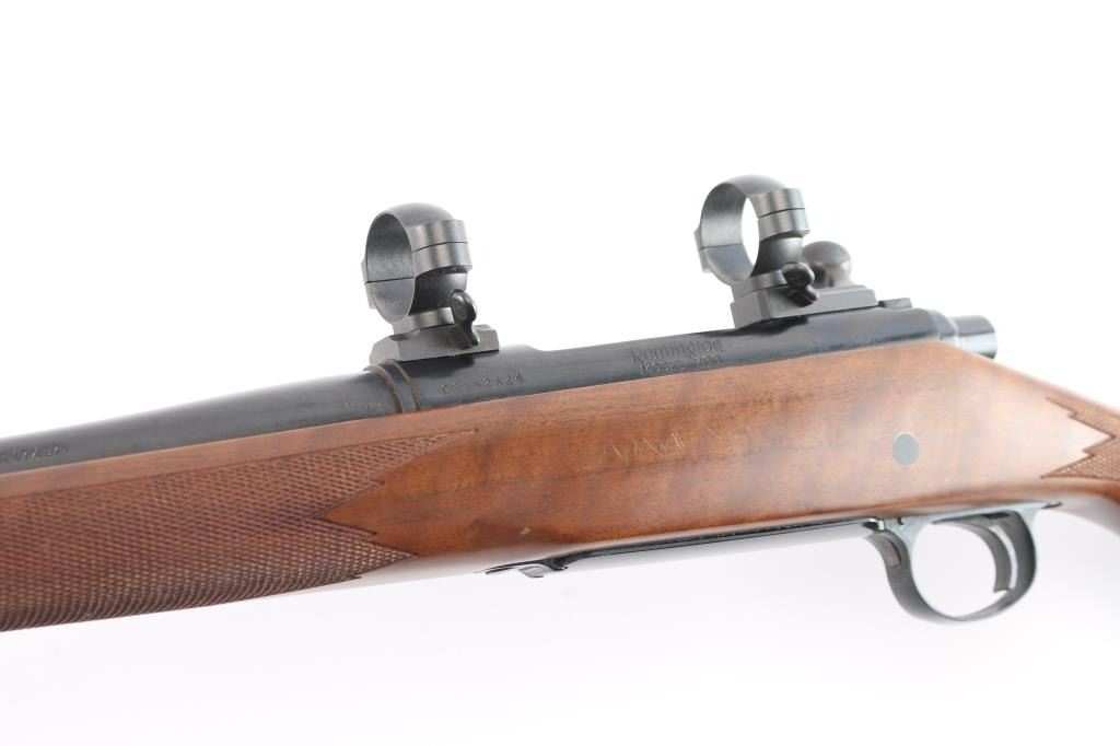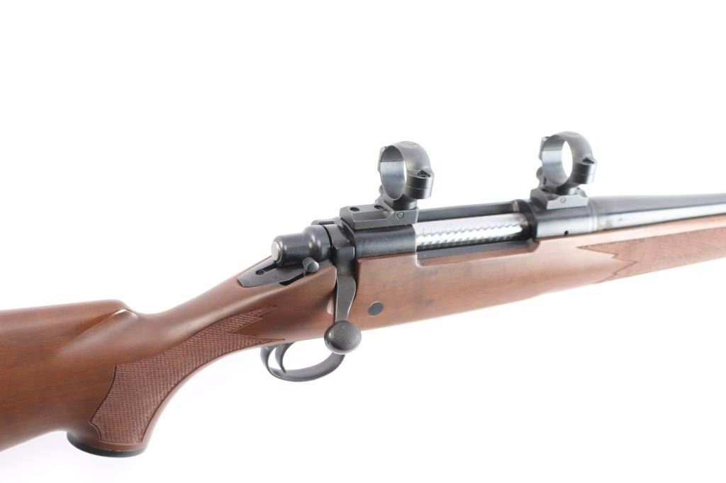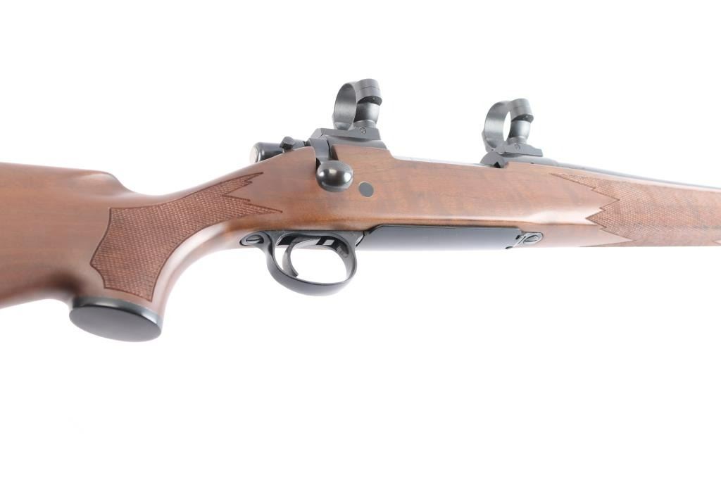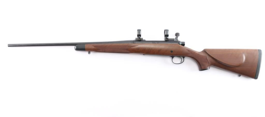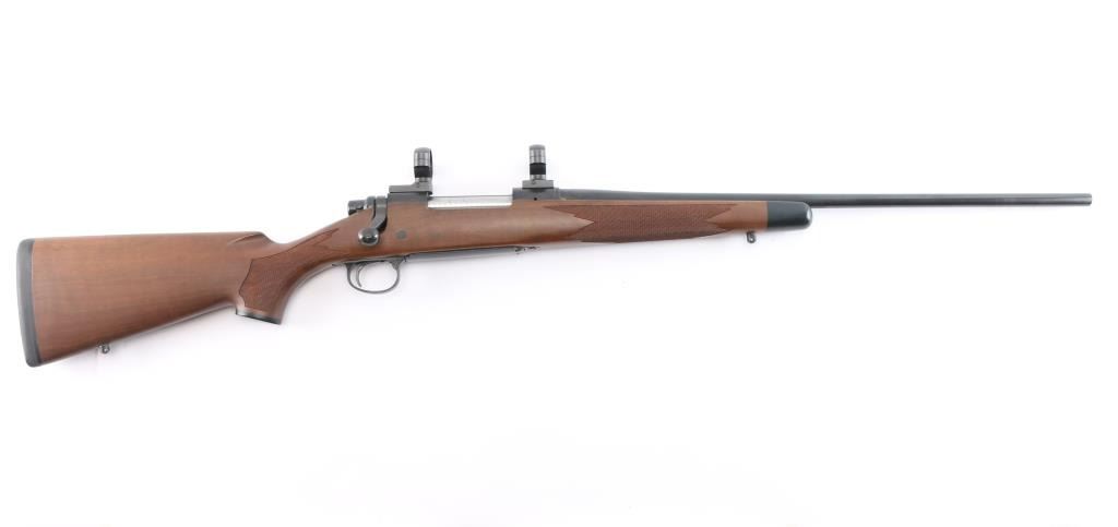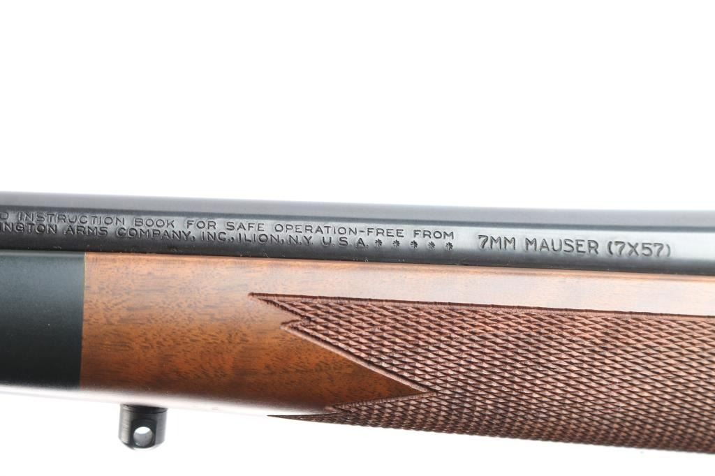 'Long Action' American bolt action sporting rifle chambered in 7mm Mauser (7x57mm). Features blued finish, walnut stock with checkered panels at wrist & forend, right hand cheek piece, factory solid rubber recoil pad, sling studs, plain black grip cap, black forend tip. 22" tapered barrel, no sights, Leupold quick detach rings (no scope) & bases, hinged floorplate, manual safety. Bore is bright. Retains 95% finish with handling marks. Stock is near excellent with few minor blemishes.