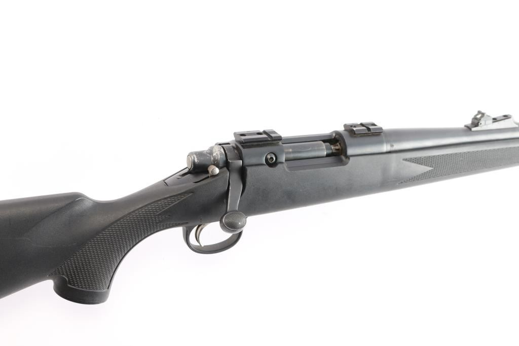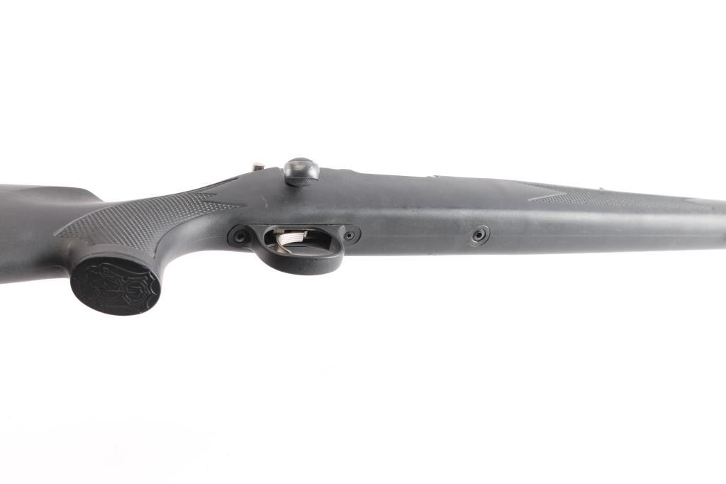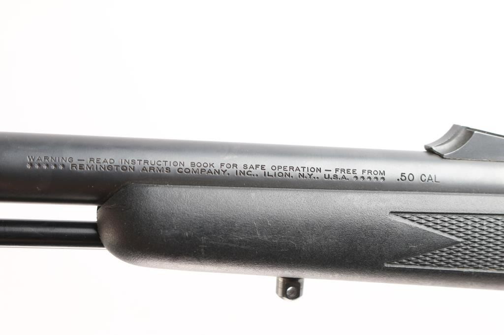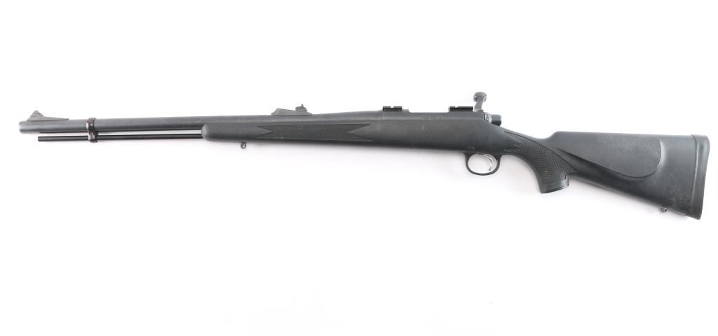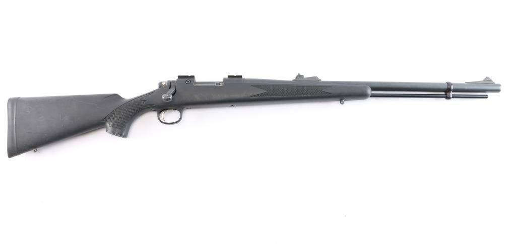 Bolt action, single-shot percussion rifle. 99% matte-black finish, with one piece , checkered, black synthetic stock, factory rubber recoil pad, sling swivel studs, manual thumb safety. 24" barrel, with adjustable rear sight, blade/bead front. Action is smooth/tight. Bore is excellent/bright. Metal ramrod.