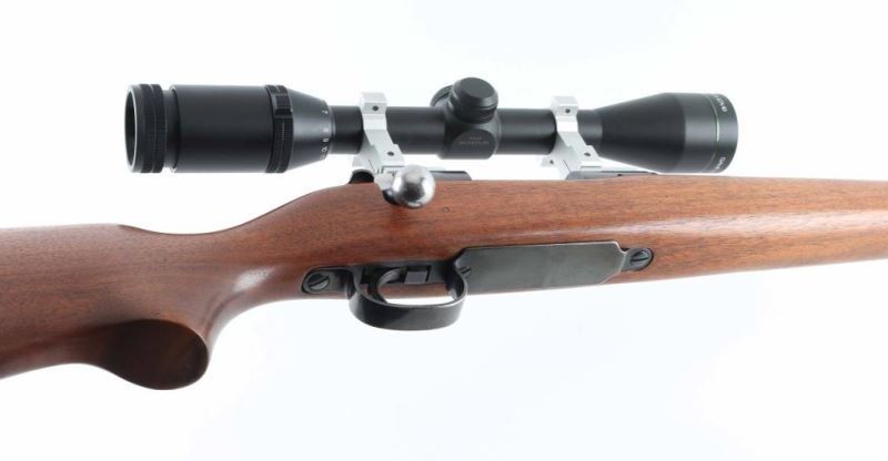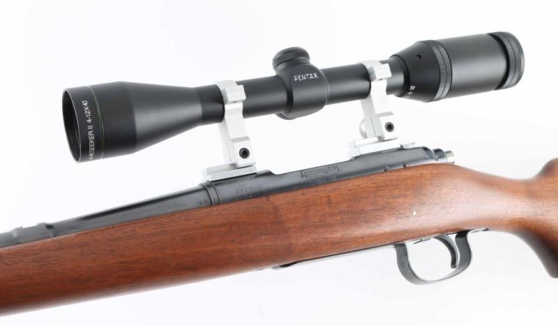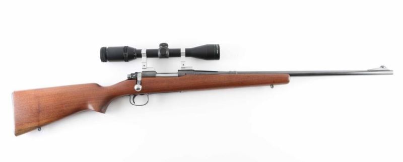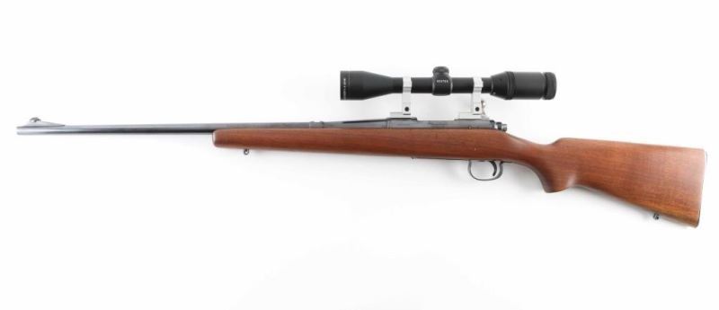 Bolt action rifle features blued finish, 24" barrel, smooth walnut stock, blade front sight, empty dovetail in barrel (sight removed), two piece C4D scope bases with very tall rings, manual safety, sling studs, ribbed aluminum factory buttplate. Bore is very good condition. Retains 85% finish with scuffs, scratches on bottom metal, bare metal at muzzle. Stock is very good condition. Mounts a very good condition Pentax Game Seeker 4-12x scope, clear view, range finding reticle. Scope is mounted slightly canted. High rings place centerline of scope approx 2.5" over bore axis. Condition is NRA Very Good++ *** C&R Firearm ***