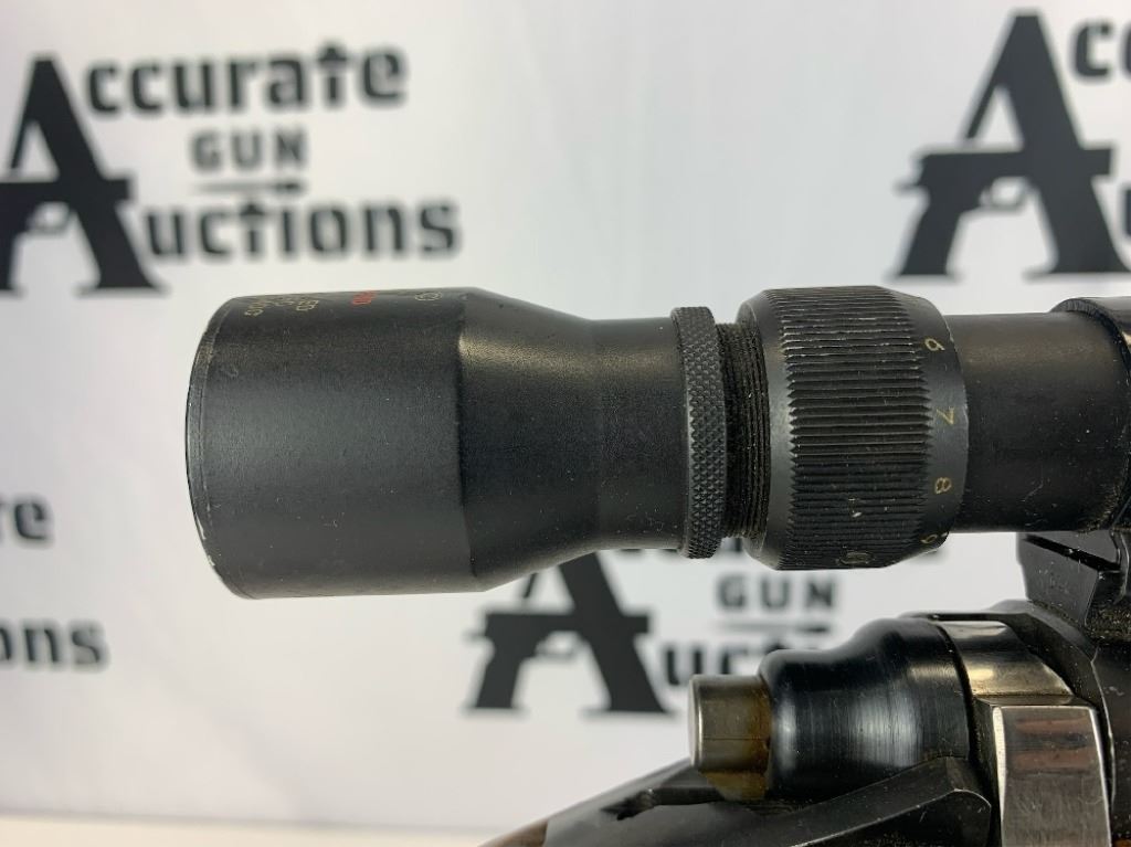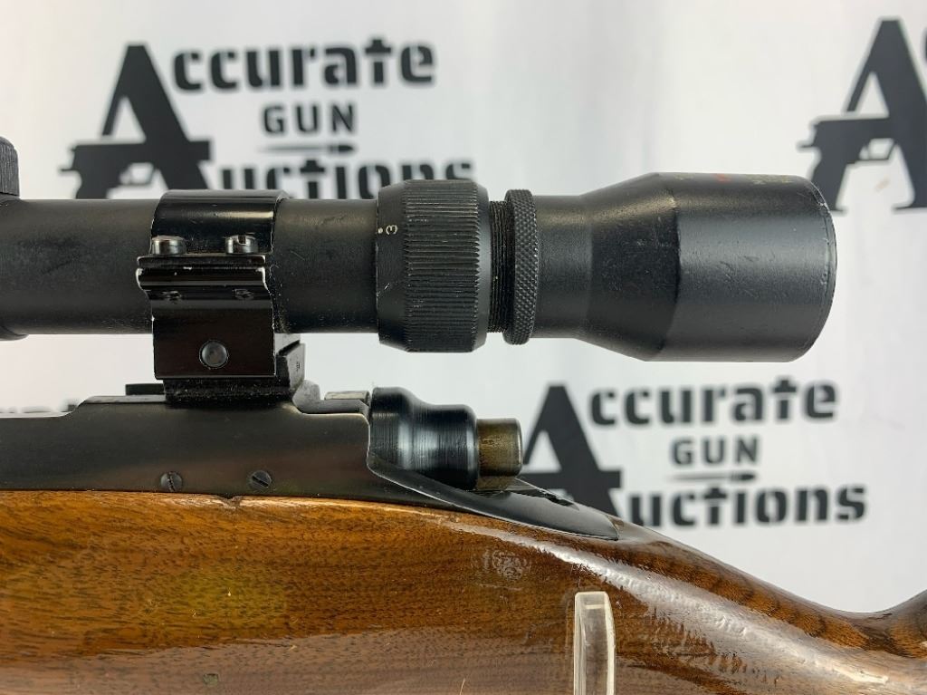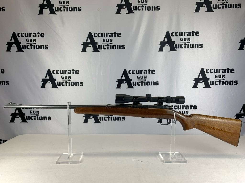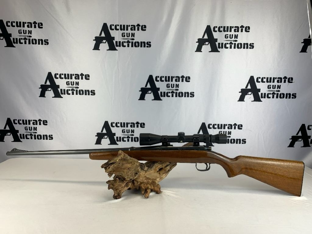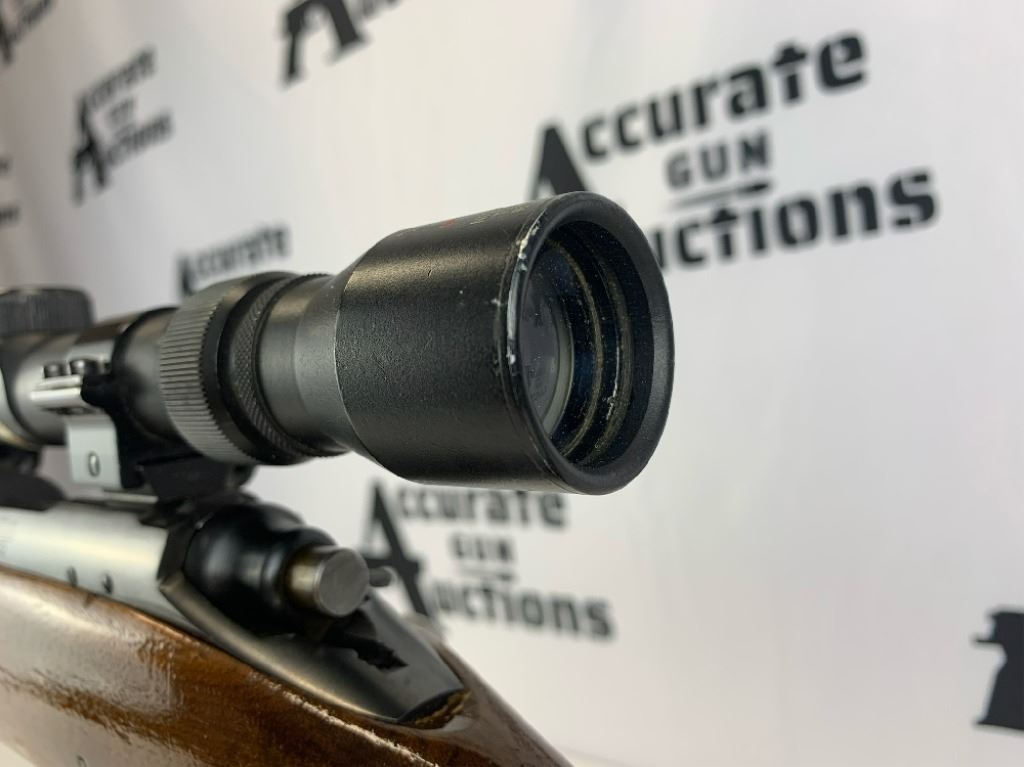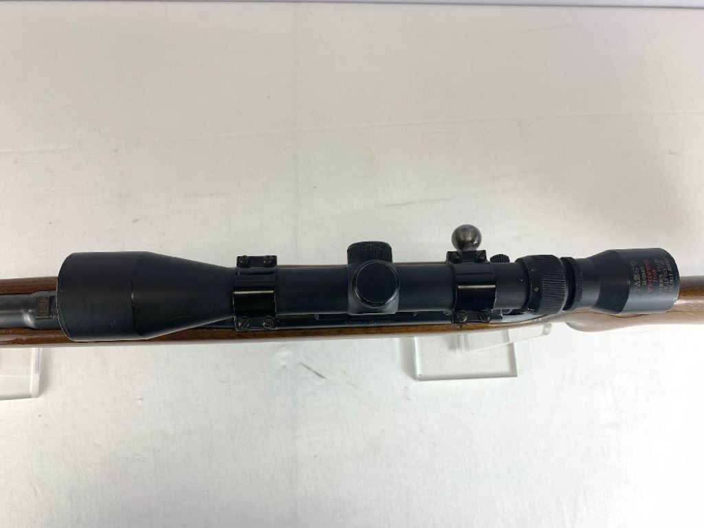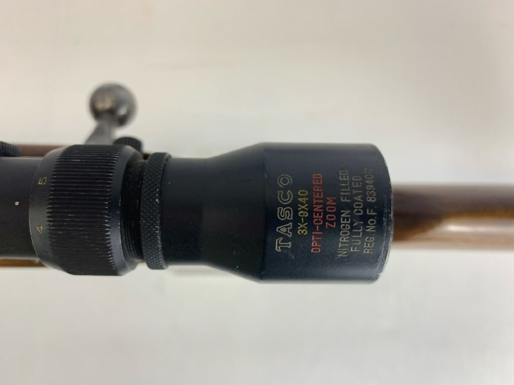 With an overall length of 43", this rifle comes with a Tasco scope (3X-9X40) mounted atop. Also has ramp front sight, metal buttplate, and wooden furniture that is still in great condition. Please see photos.