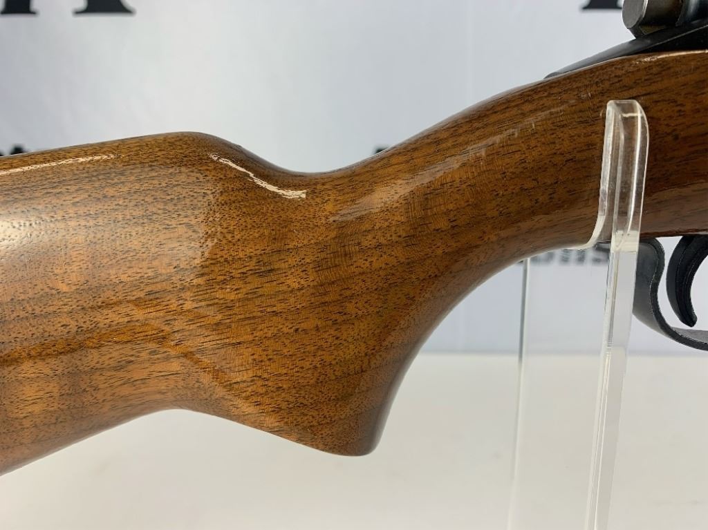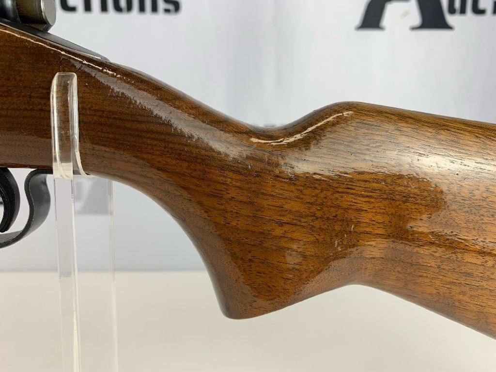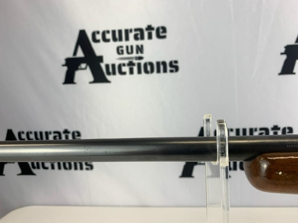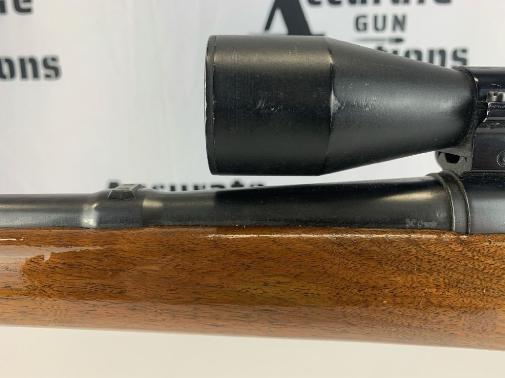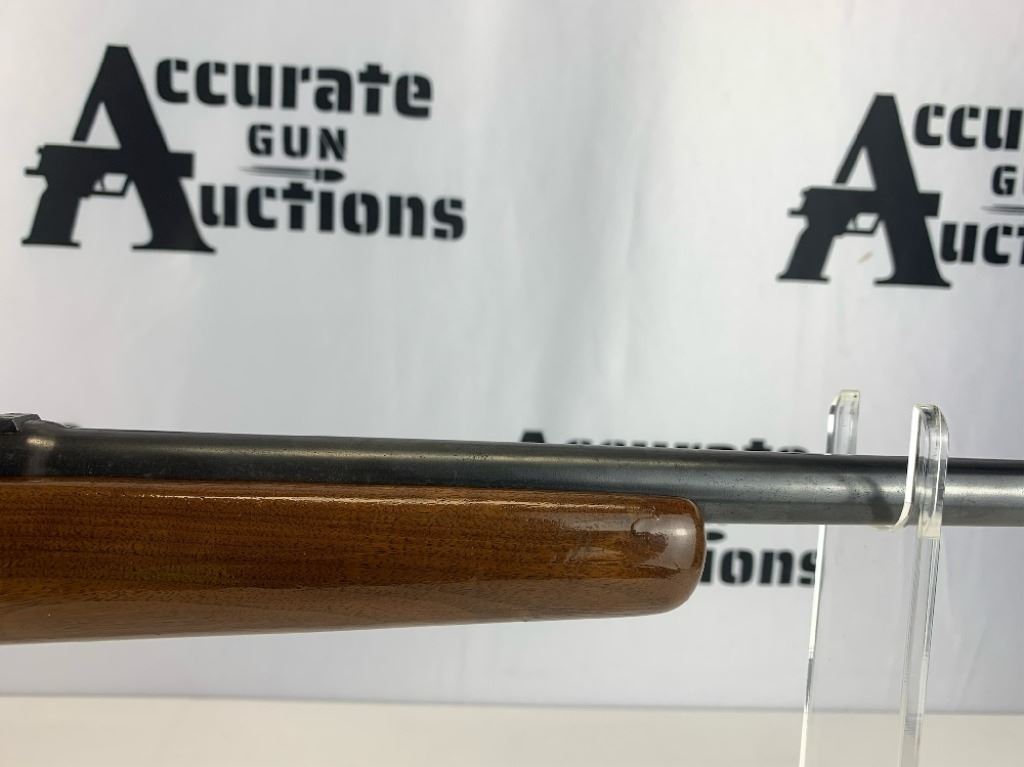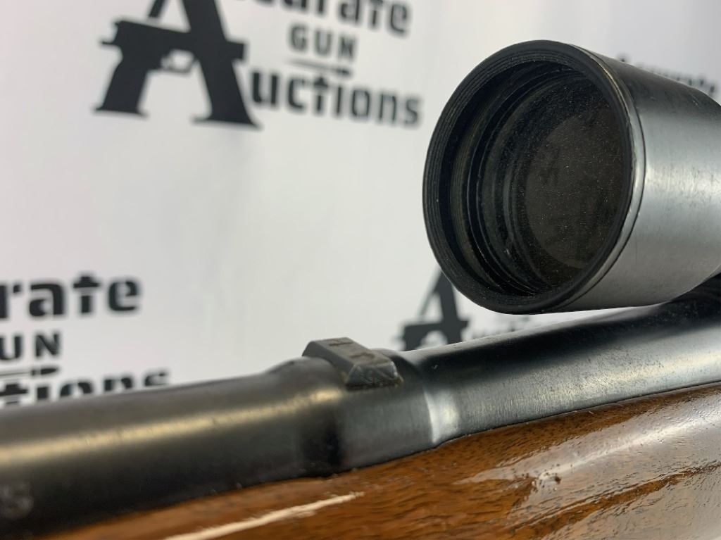 With an overall length of 43", this rifle comes with a Tasco scope (3X-9X40) mounted atop. Also has ramp front sight, metal buttplate, and wooden furniture that is still in great condition. Please see photos.