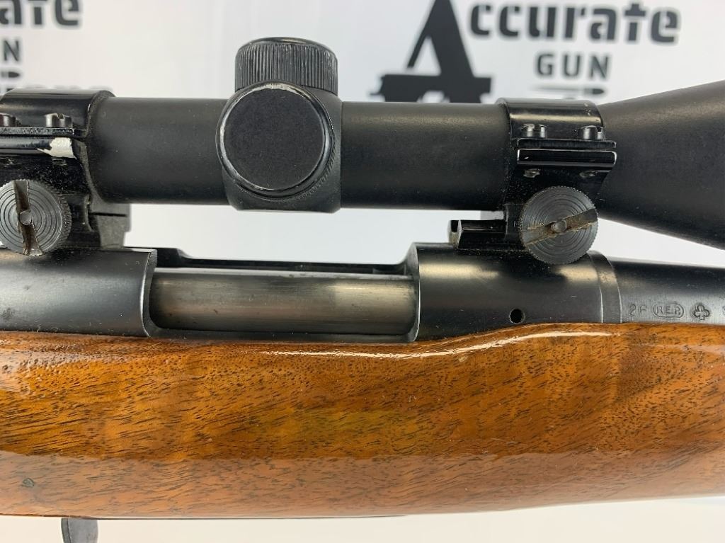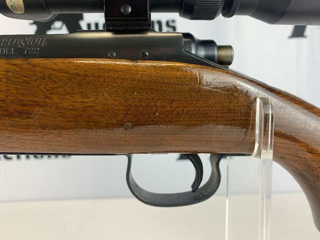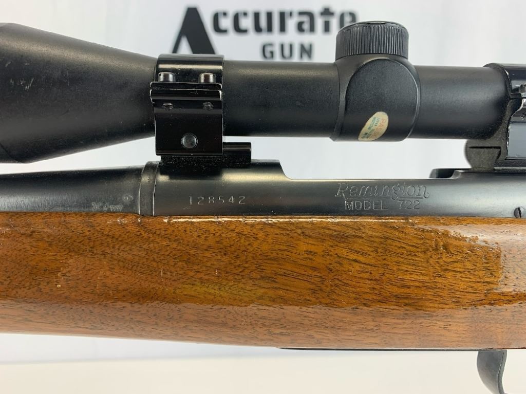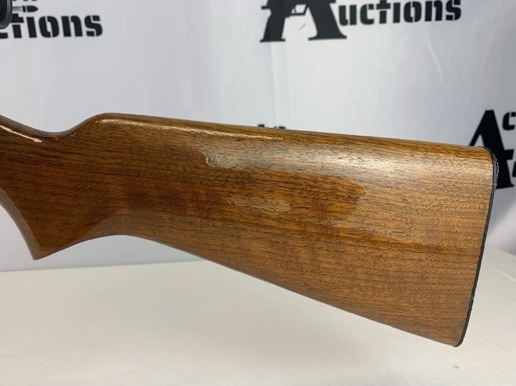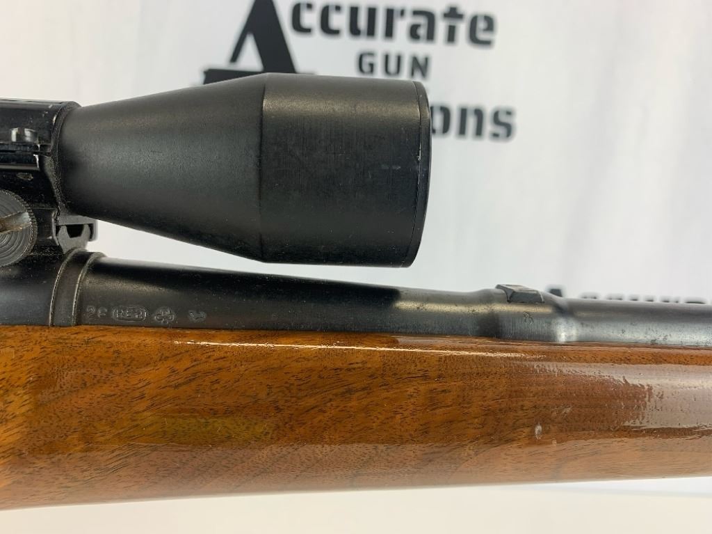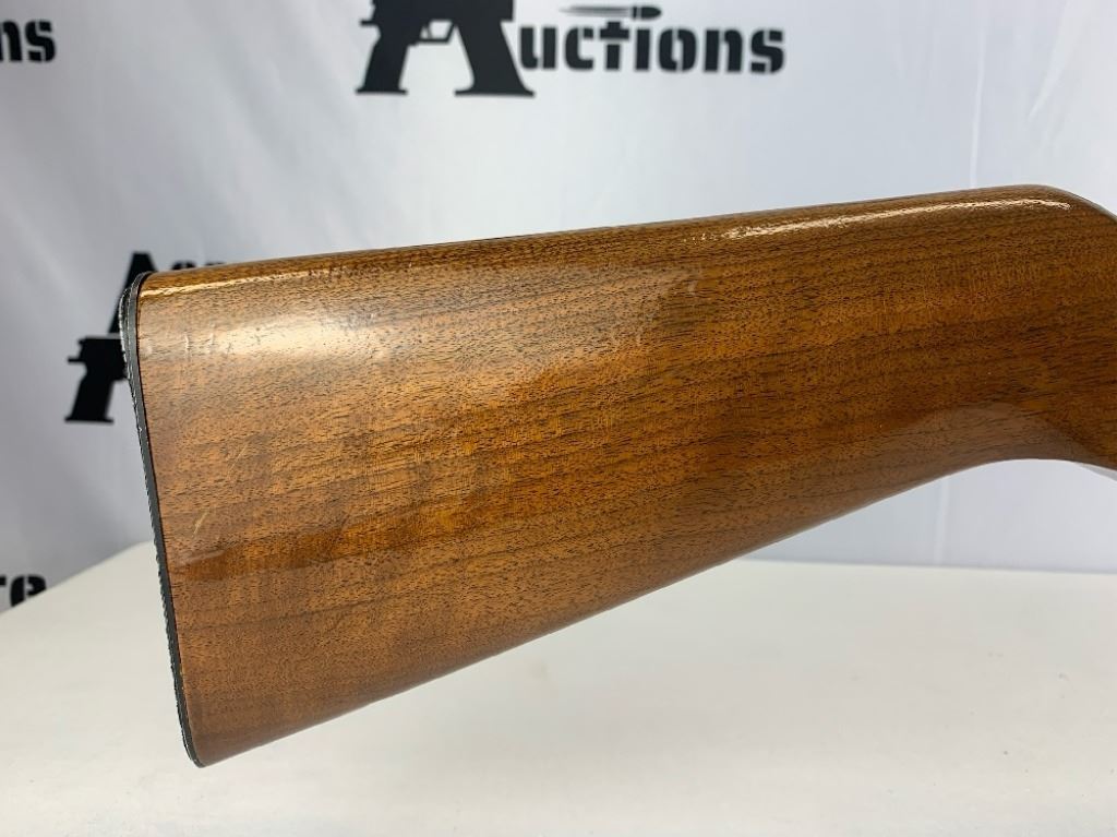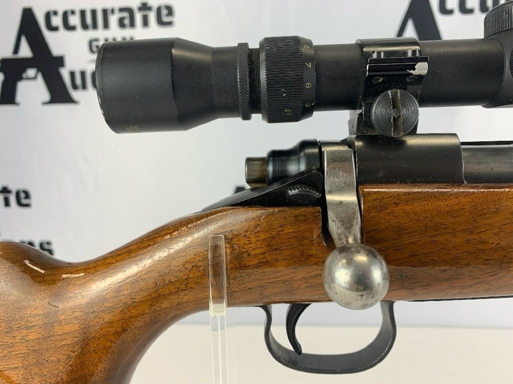 With an overall length of 43", this rifle comes with a Tasco scope (3X-9X40) mounted atop. Also has ramp front sight, metal buttplate, and wooden furniture that is still in great condition. Please see photos.