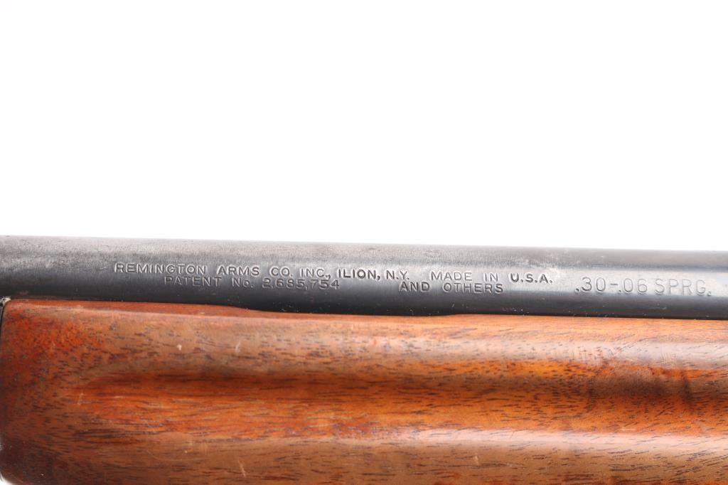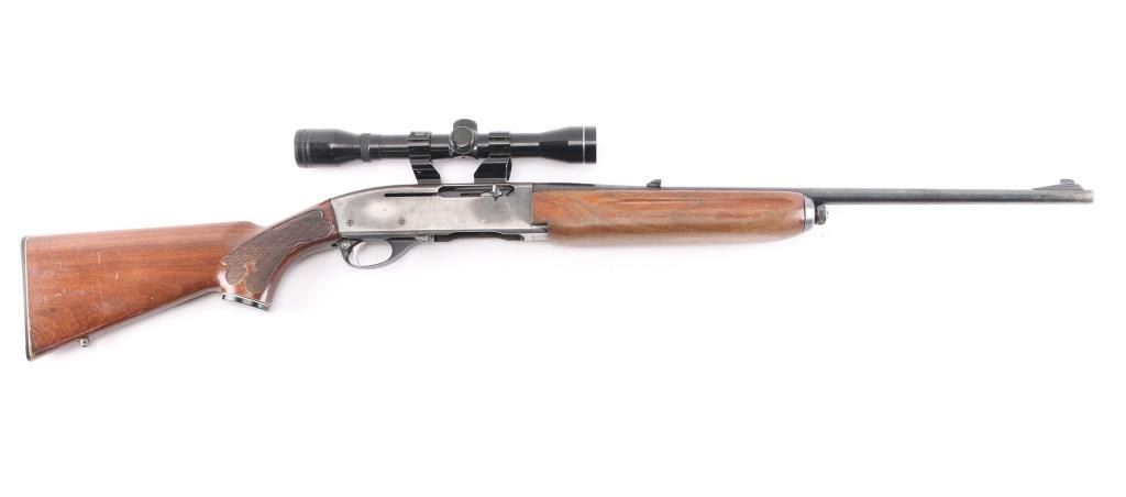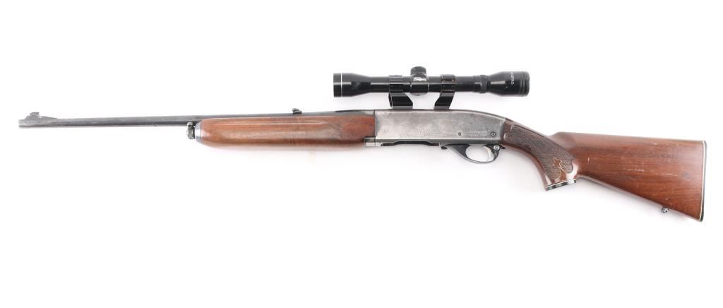 "Woodmaster". Semiautomatic rifle features blued finish, smooth forend, checkered grip stocks, 22" barrel, blade/bead front sight, adjustable rear flip sight, manual safety, sling swivel studs, mounted with a Tasco Pronghorn 4x32 scope with see through rings. Bore is very good ,strong rifling, bright. Factory black plastic buttplate. Metal retains about 45% coverage of blue finish, with a lot of handling wear, mostly on the receiver, the barrel has some scattered light pin-prick pitting. Wood is sound/Good , scuffs & scratches in several places, handling loss on the forearm. No magazine.