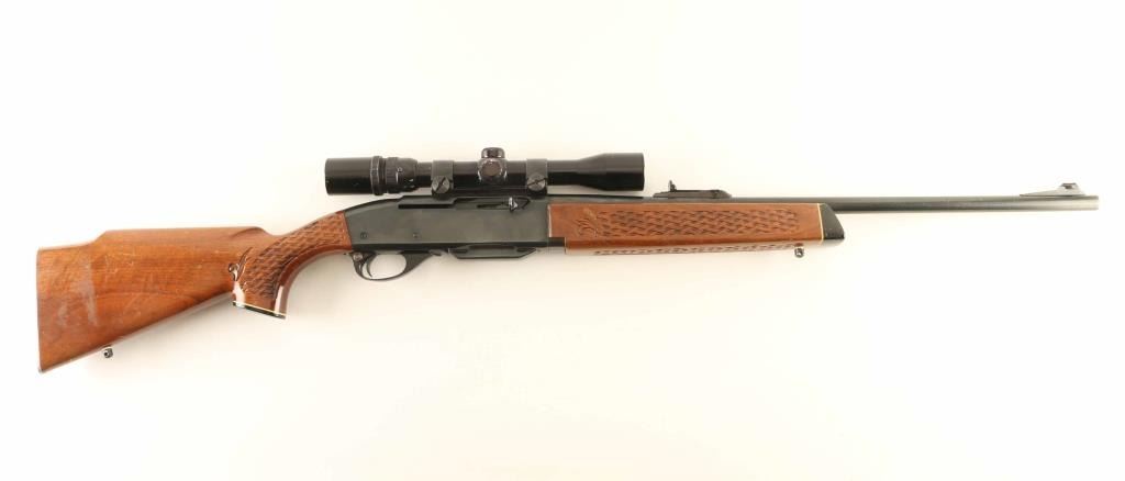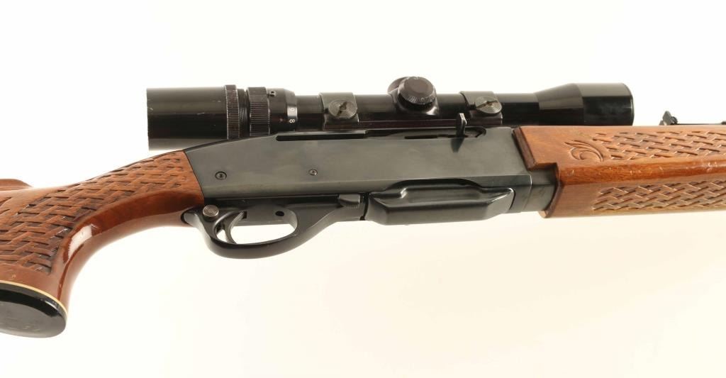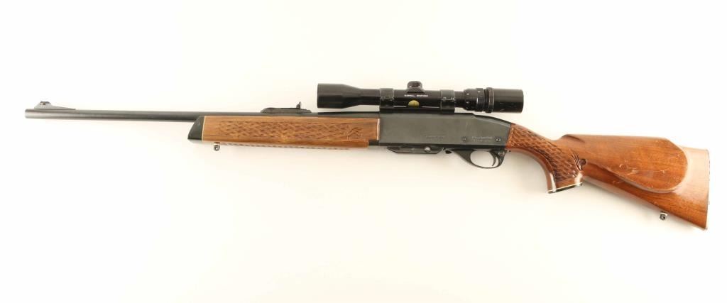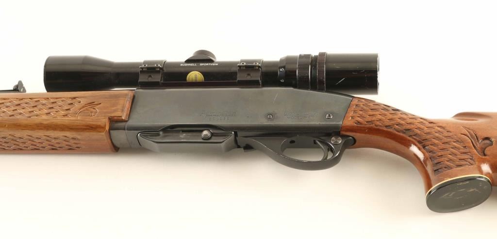 Semiautomatic rifle features blued finish, urethane finished wood, 22" barrel, buckhorn style sights, detachable magazine, manual safety, basket weave pattern "checkering" at sides of forend and pistol grip, right hand cheekpiece, aluminum buttplate, swivel studs. Bore is excellent condition. Retains 80% blue, with scratches and scuffs. Wood is good to very good condition with scratches in finish, some heavier scrapes to butt. Butt has some fiddleback figure on right side. Includes a good condition 3-9x Bushnell Sportview scope, Weaver type rings & base. Condition is NRA Very Good *** Modern Firearm ***