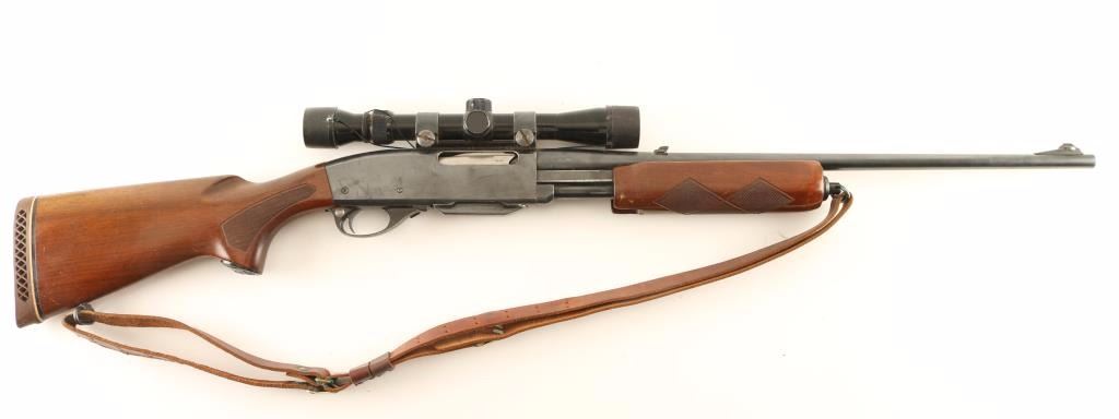 'Gamemaster' Slide-action sporting rifle chambered in .270 Winchester. Features a blued finish, 22" tapered barrel, ramped blade front sight with silver bead, flip-up adjustable rear sight, Tasco 3-9x 32mm scope, push button safety, detachable magazine, smooth trigger, brown leather sling, checkered walnut slide handle and pistol grip shoulder stock with Pachmayr recoil pad. Rifle exhibits approximately 90% of it's original blued finish showing scattered handling marks, light oxidation on the receiver and slide wear on the barrel, magazine tube & slide arm. Action is smooth, bore is excellent, optics are clear and wood stocks are good with a moderate amount of blemishes. Condition is good to very good. ***Modern Firearm***