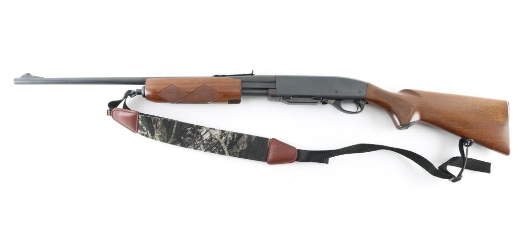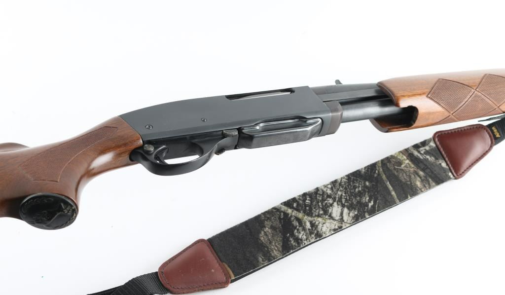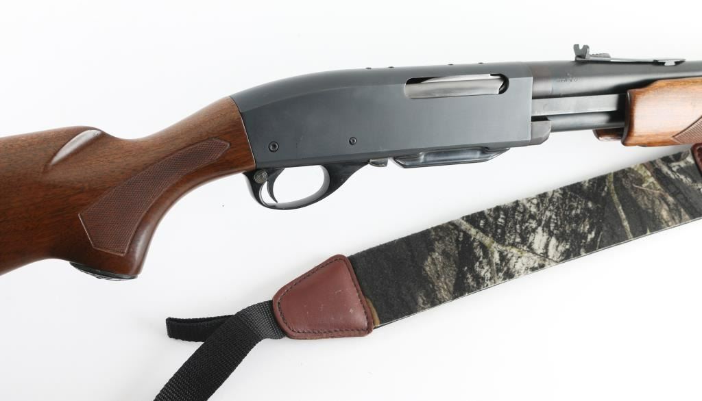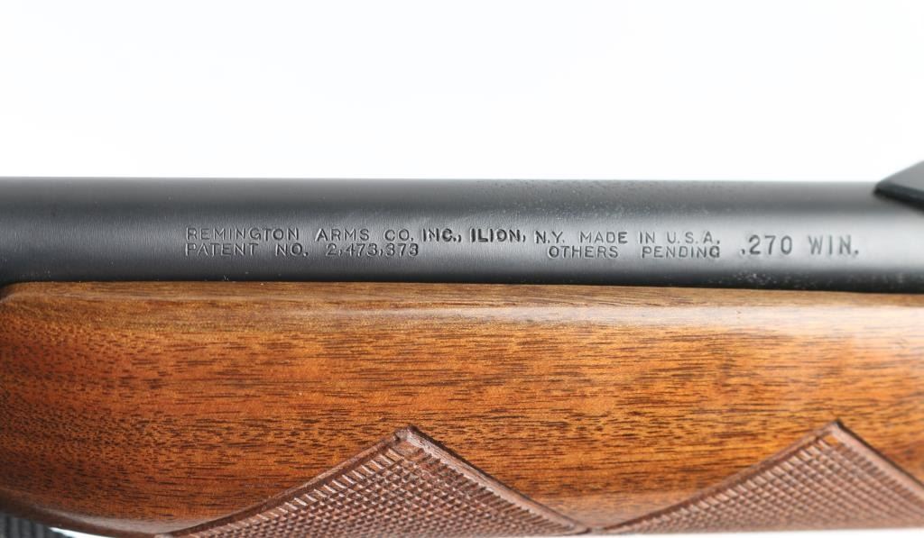 Made in America this is a pump action rifle chambered for .270 WIN cartridges. It features a 22" blued barrel and receiver with a matte finish. It sports a ramped blade front sight, sporting rear sight with elevation slider, a detachable box magazine, safety in back of trigger guard and a smooth trigger. The wood stocks are checkered at the wrist and forearm with a deer embossed black grip cap and a serrated Remington metal butt plate. Metal finish looks to have been redone and is covering some past pitting both on the receiver and the barrel. The wood stocks look very good with minor signs of handling and a small ding on the left side of the butt stock. Bore looks great, bright. Comes with an Allen padded sling, swivels and one magazine. Condition is NRA Good as refinished *Modern Firearm*