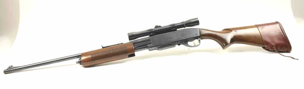 Remington 760 Gamemaster pump action rifle, #252505, .30-06 cal., 22” barrel, blued finish, adjustable sights, detachable magazine, wooden stock with aluminum butt plate, topped with an unmarked vintage scope. The rifle is in near fine condition overall, retaining approximately 95-97% original finish, the bore is mirror bright, with crisp markings. The stock is very good with minor chips out of the pistol grip, andminor scrapes and dents, but over all very nice. Butt is covered with a vintage leather cover. A great example of an American classic hunting rifle in fantastic condition. One mag. (C&R/PPT) Est. $350-700