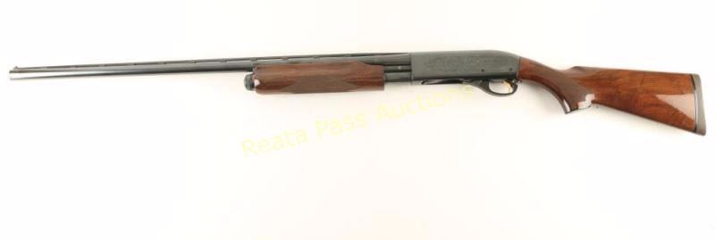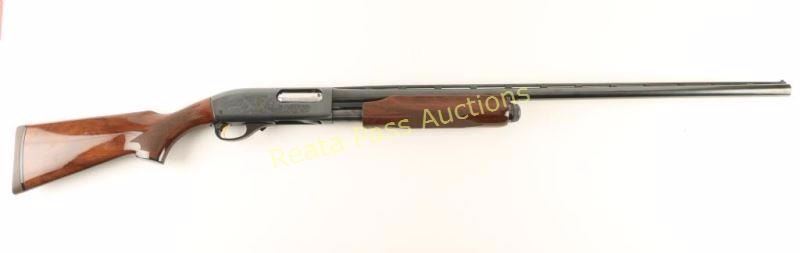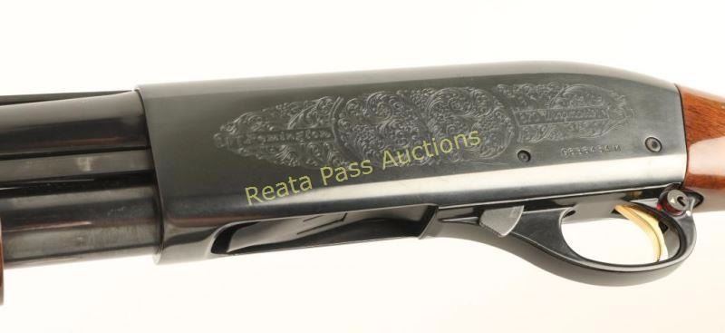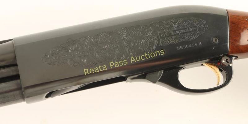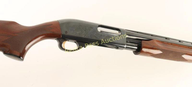 'Wingmaster' Engraved slide action repeating shotgun chambered for 2 3/4" & 3" 12 gauge shells. Features a blued finish, Light Contour 30" vent rib barrel with removable choke, bead sights, push button safety with integral lock, floral pattern laser engraved receiver, beveled trigger, 1/2 length tube magazine, checked high gloss American Walnut slide handle and pistol grip shoulder stock with black pistol grip cap & factory rubber recoil pad. Shotgun exhibits approximately 96% of it's original finish showing only few light handling marks and slide marks on the magazine tube. Action is smooth, bore is bright with some debris and wood stocks are fine. Condition is near excellent. ***Modern Firearm***