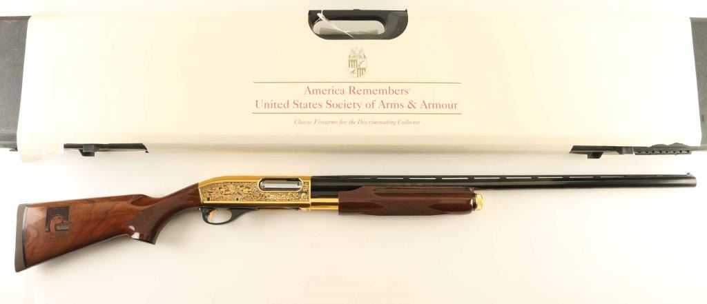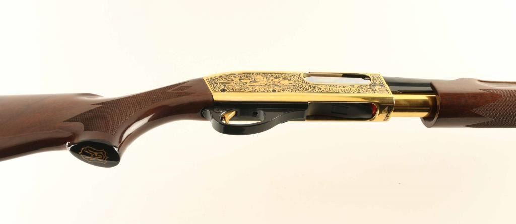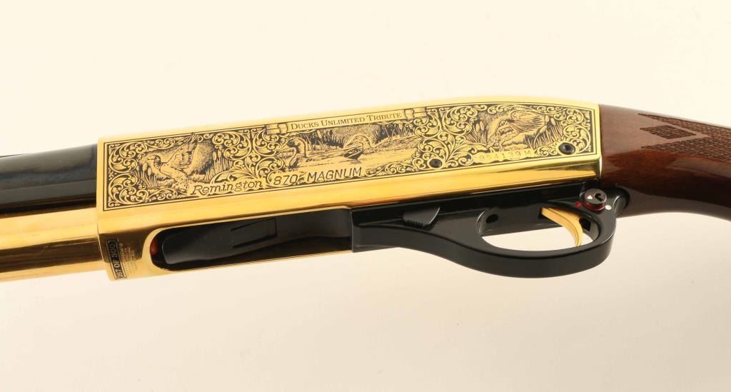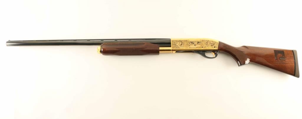 Pump Action shotgun accepts 12 Gauge shells up to 3" in length. Features 28" light contour vent rib barrel, MOD choke tube installed, Bradley front bead with white polymer globe, steel mid bead, manual safety, blued barrel, Gold color finished receiver & magazine, urethane finished wood butt & forend, checkering panels at wrist and forend, solid rubber recoil pad. Receiver is engraved with game scenes featuring ducks, floral scrolls, and "DUCKS UNLIMITED TRIBUTE". Butt has large "DUCKS UNLIMITED" logo engraved on both sides. Bore is excellent condition. Overall condition is Excellent with few signs of handling. Includes plastic hard case, extra choke tubes (Full, IMP), tube wrench, small screwdrivers. Condition is NRA Excellent - almost Like New *** Modern Firearm ***