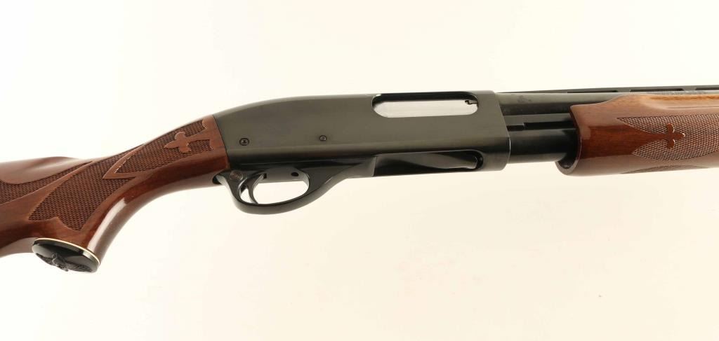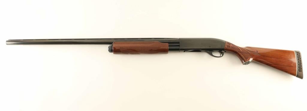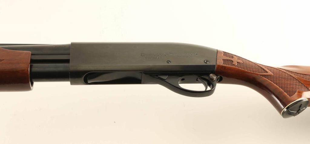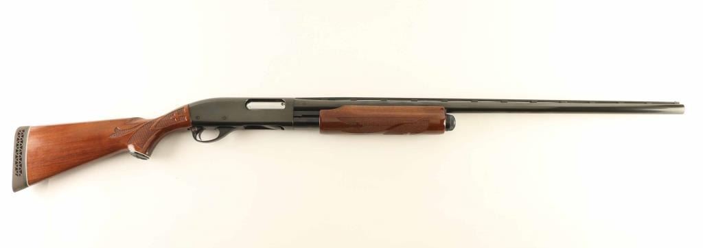 Pump Action shotgun accepts 2-3/4" shells. Features 30" vent rib barrel with FULL choke, Steel front bead, manual safety, blued finish, urethane finished wood butt & forend, checkering panels at wrist and forend, ventilated rubber recoil pad. Bore is excellent condition. Metal retains 95% finish with scratches, paint transfer to barrel near muzzle. Wood is very good condition with handling marks, dings to urethane finish at wrist and toe of butt, spot of dried white paint on front of pump handle. Condition is NRA Very Good+ *** Modern Firearm ***