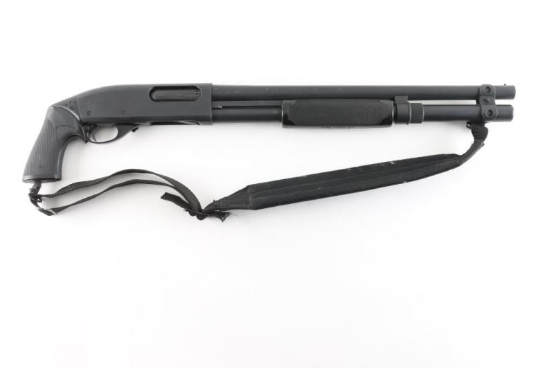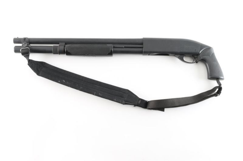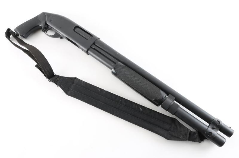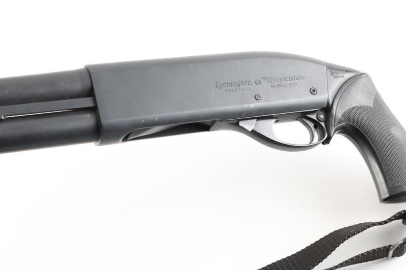 Pump action Wingmaster pistol grip shotgun with 18" barrel with steel bead front sight. Matte blue finish, checkered black rubber Pachmayr pistol grip and pump handle, full length tube magazine and padded black nylon carry strap. Bore looks ok but may be showing surface rust in two spots. Metal finish looks good but does show some signs of use and handling. Condition is NRA Good *Modern Firearm*