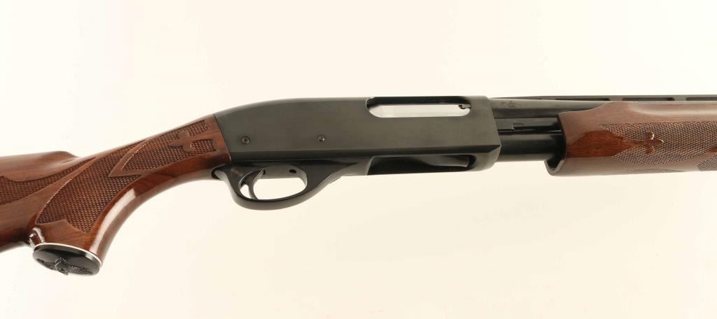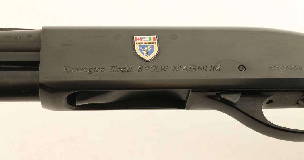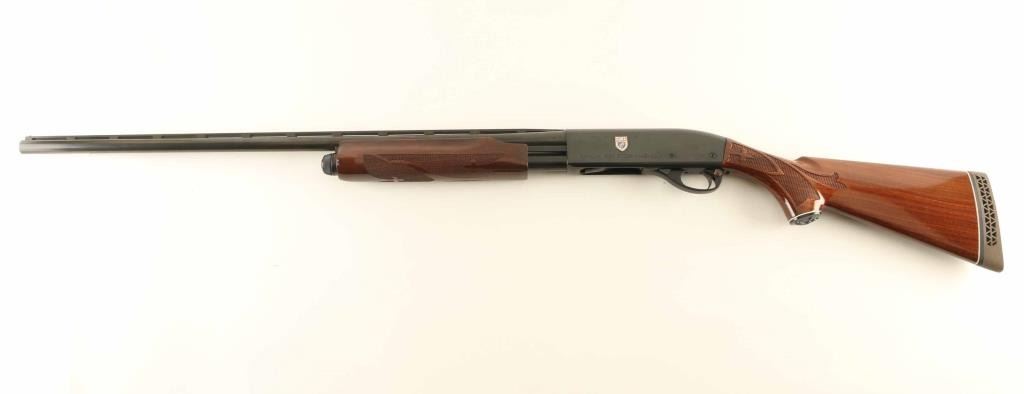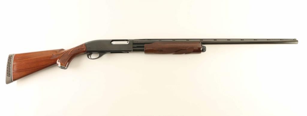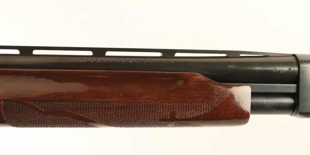 Pump Action shotgun accepts up to 3" shells. Features 28" vent rib barrel with MOD choke, Steel front bead, manual safety, blued finish, urethane finished wood butt & forend, checkering panels at wrist and forend, ventilated rubber recoil pad. Bore is excellent condition. Metal retains 95% finish with scratches and handling marks. Wood is excellent condition. Left side of receiver bears a small full color "Ducks Unlimited" badge, beginning to peel off. Condition is NRA Very Good+ *** Modern Firearm ***