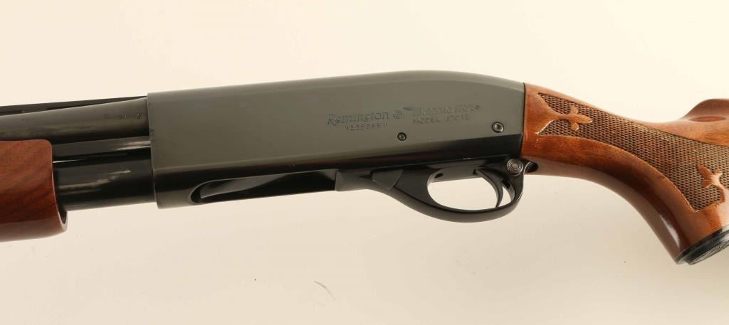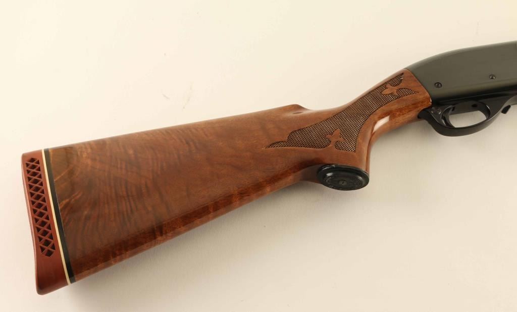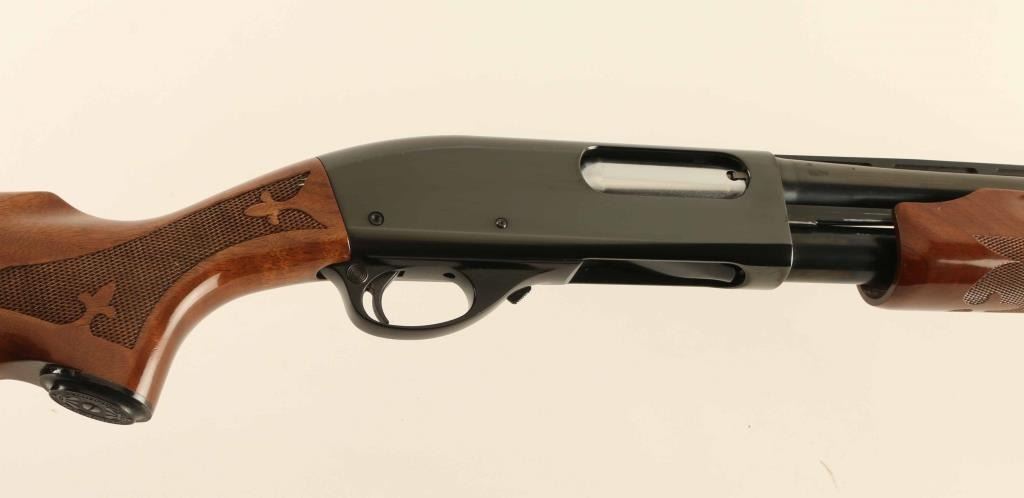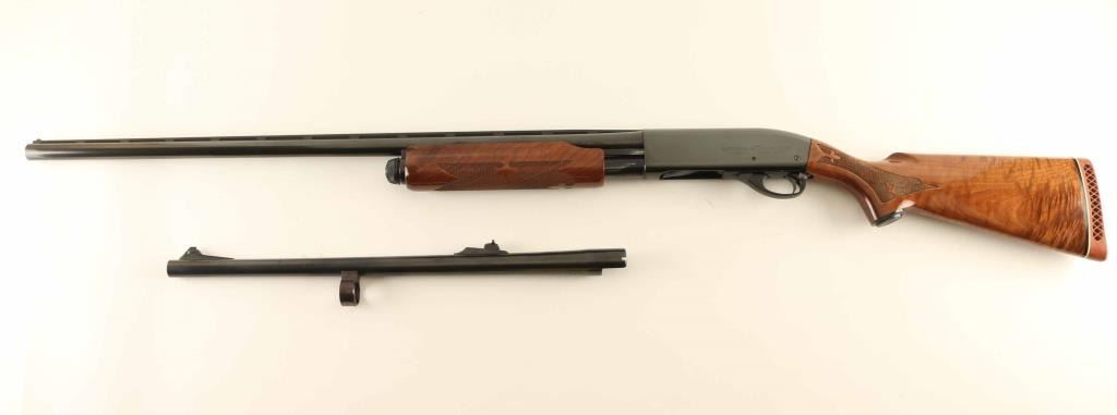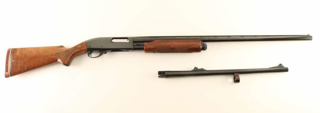 'Wingmaster Trap' Vintage slide action repeating shotgun chambered for 2 3/4" 12 gauge shells manufactured circa 1979. Features a blued finish, full choked 30" barrel with ventilated sighting rib, white bead front sight, silver bead mid-sight, 4 round tube magazine, smooth trigger with beveled edges, alloy trigger guard, steel receiver, dual action bars, push button safety, deluxe walnut forend with press checkering & high gloss finish, and semi-pistol grip shoulder stock with factory grip cap & red rubber recoil pad. Also includes a 1979 vintage 20" smoothbore barrel with rifle sights. Shotgun retains approximately 98% of its original blued finish showing a small bright scratch on the left side of the barrel towards the muzzle and some slide wear on the magazine tube & action bars. Action is crisp, the bore is pristine and the wood stocks are near fine with some light blemishes. Condition is near NRA Excellent. ***Modern Firearm***