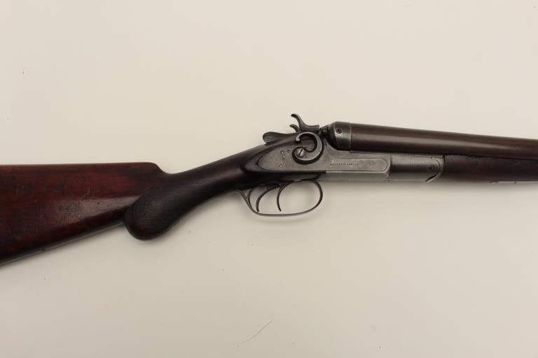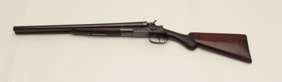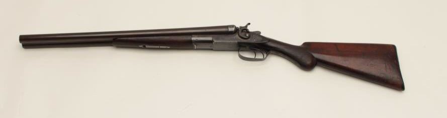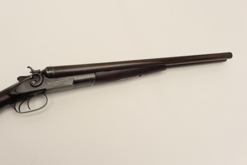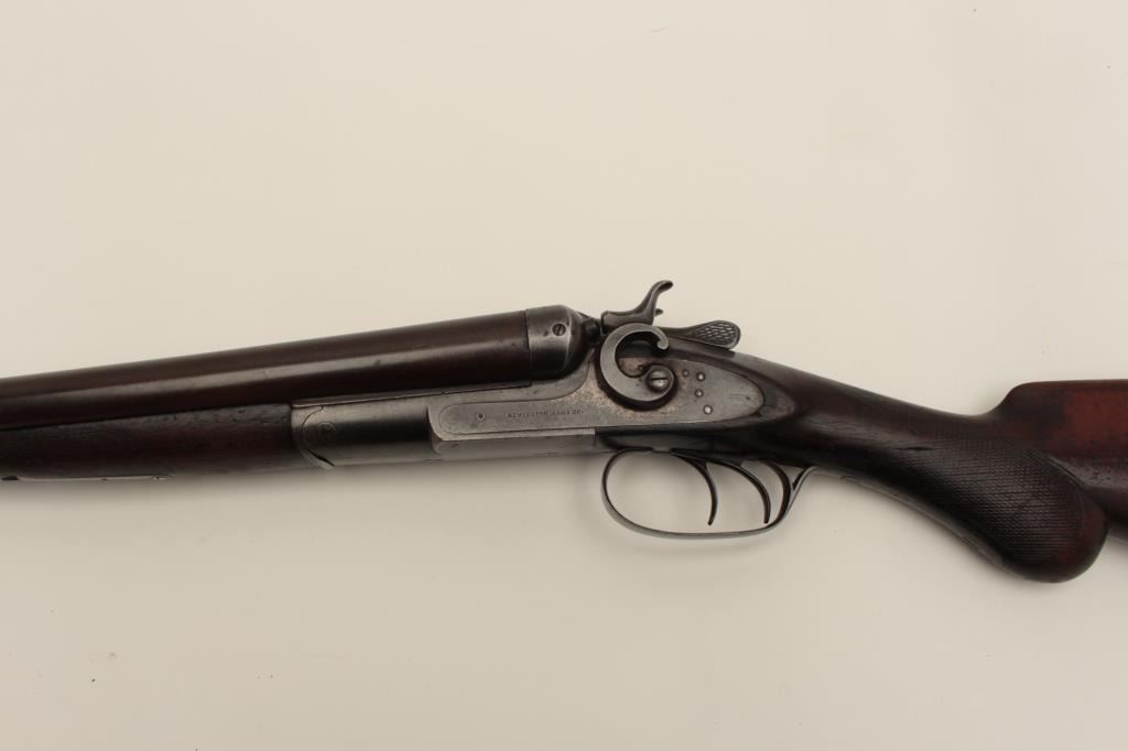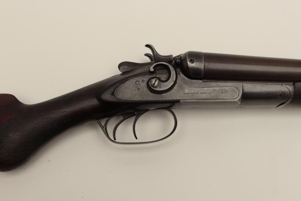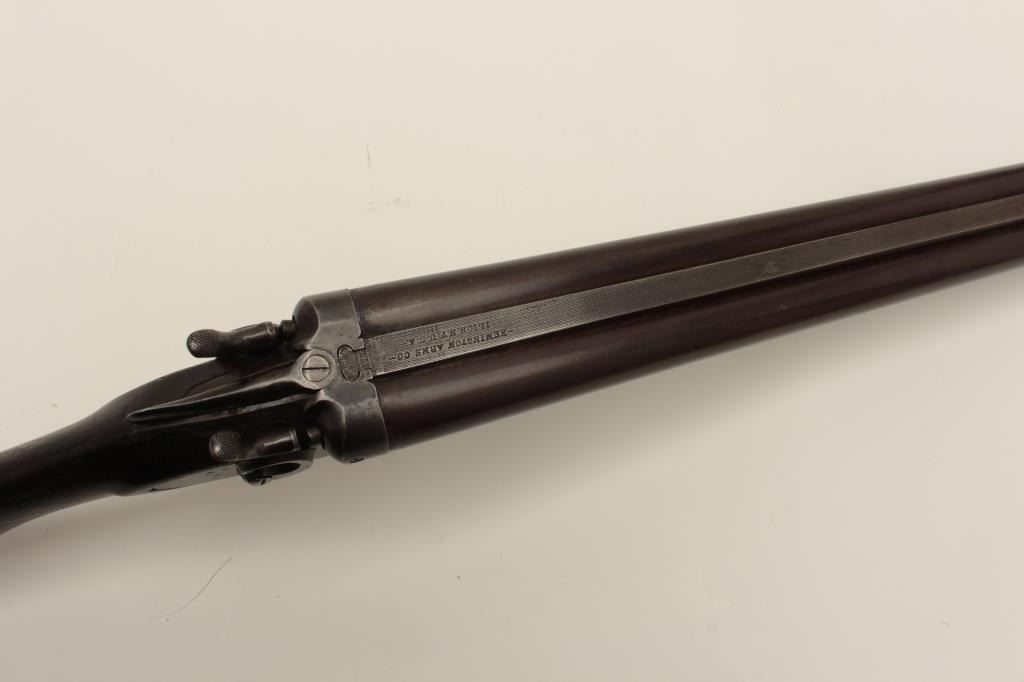 Remington Arms Co. SxS exposed hammers shotgun, 12 gauge, barrels cut to 20” (coach gun style), brown finish, checkered wood stocks, S/N 205077, in overall good condition as modified; good actions, dark bores, goodmarkings and fair to good wood showing wear and scattered old mars and scratches from carry and storage. (C&R). Est.: $300-$600.