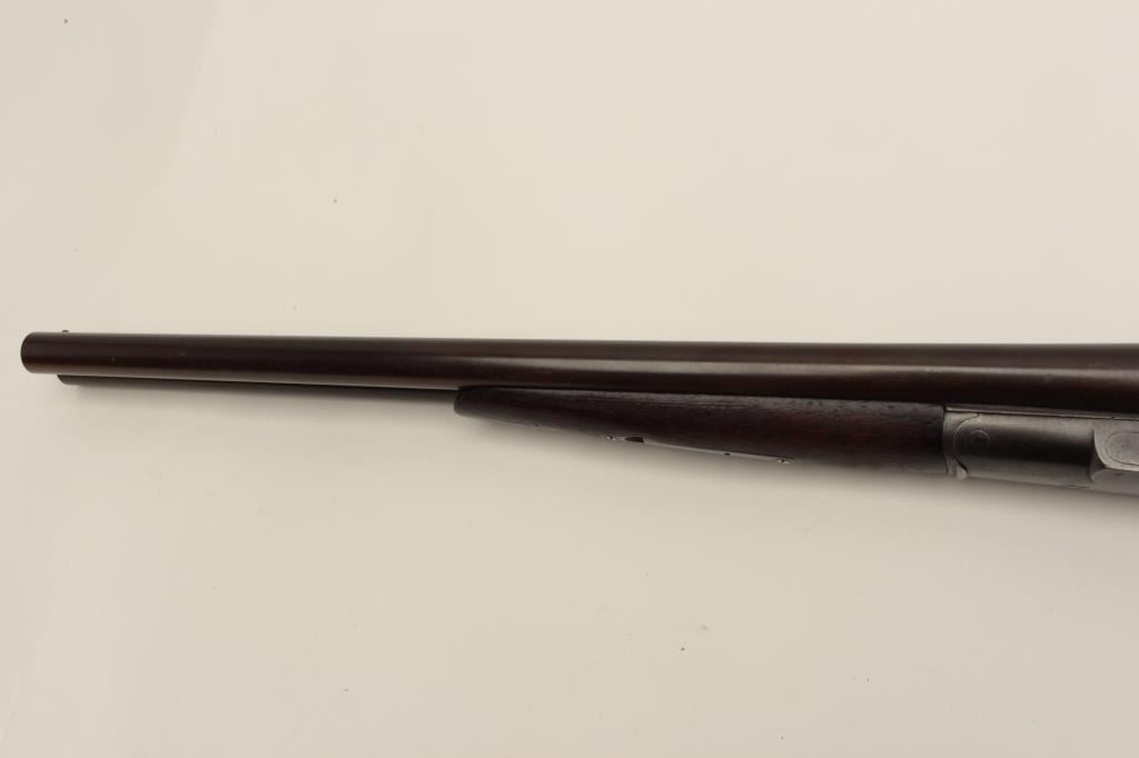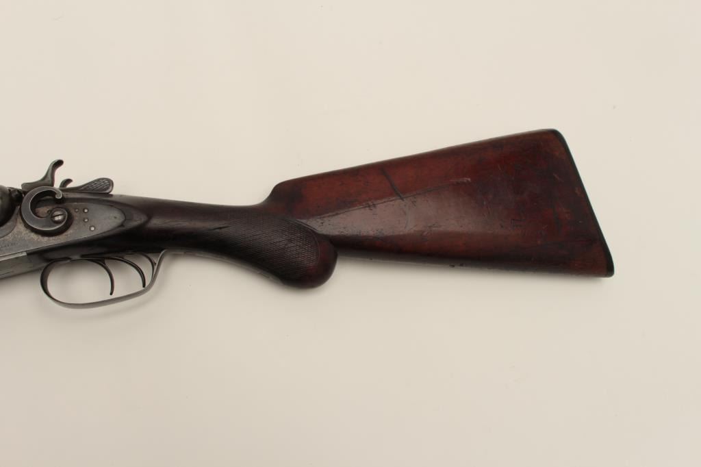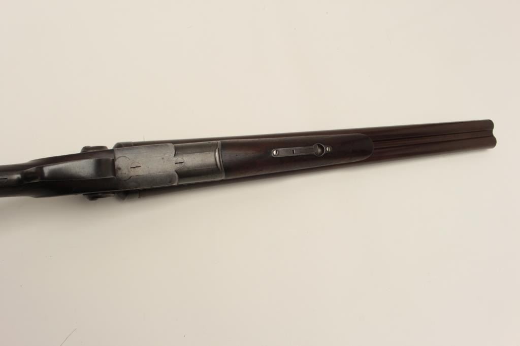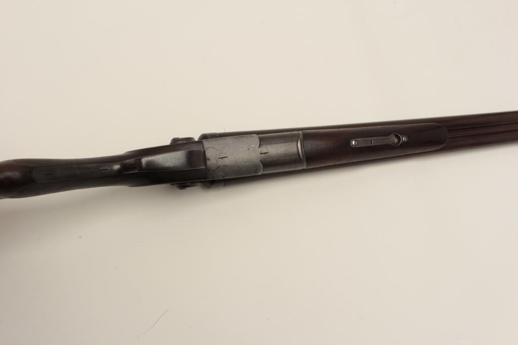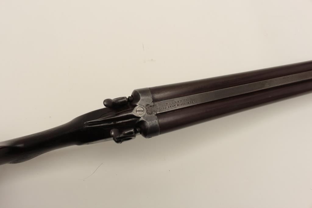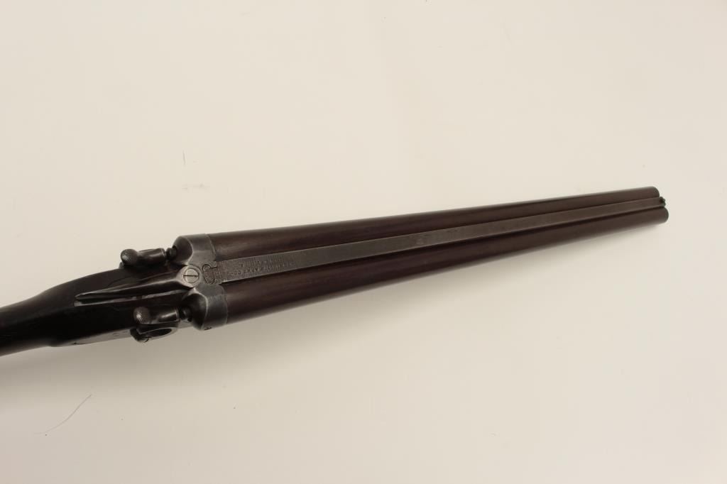 Remington Arms Co. SxS exposed hammers shotgun, 12 gauge, barrels cut to 20” (coach gun style), brown finish, checkered wood stocks, S/N 205077, in overall good condition as modified; good actions, dark bores, goodmarkings and fair to good wood showing wear and scattered old mars and scratches from carry and storage. (C&R). Est.: $300-$600.