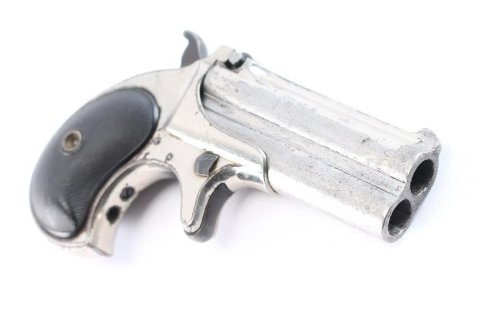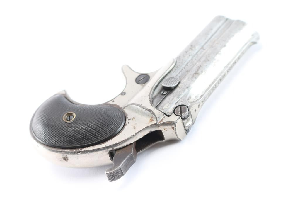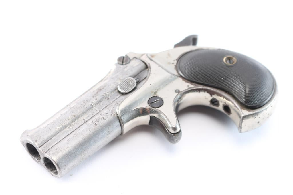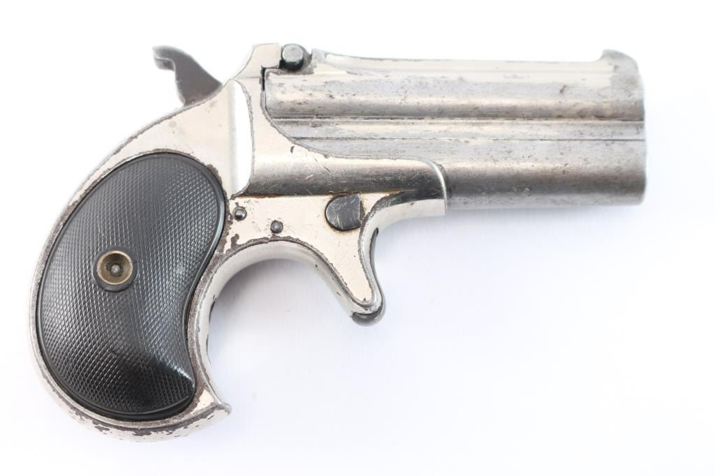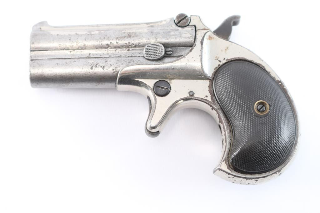 With 1 line Remington Arms Co, Ilion, NY address. 30-50% original nickel with good grips. Releaselatch sheared and broken away, right hinge "ear" sheared off. Many small nicks and mars. Restorable. John Kopec estate collection.