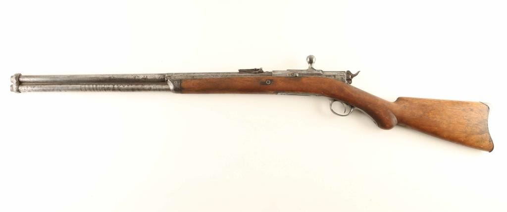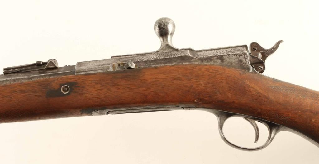 NVSN 'Model B' Bolt action rifle features 24" half round half octagon barrel, full length magazine tube under barrel, half length wood stock, blade front sight, flip-up ladder type rear sight, magazine cutoff lever, external hammer must be manually cocked for each shot. Metal surfaces appear originally blued, now retain traces of brown patina over large areas of lightly pitted dull silver bare metal, with several areas of moderate pitting. Stock features steel buttplate, checkered Prince of Wales shaped grip, shows signs of heavy use and some cracks on right side near bolt. Bore is fair condition, lightly eroded & frosted, with sharply defined rifling remaining. Magazine cutoff lever does not appear to work correctly. Action operates smoothly and appears functional. Most markings eroded, three line address & patent marking on bolt rear partially legible. Condition is NRA Good + *** Antique Firearm ***