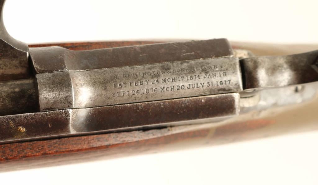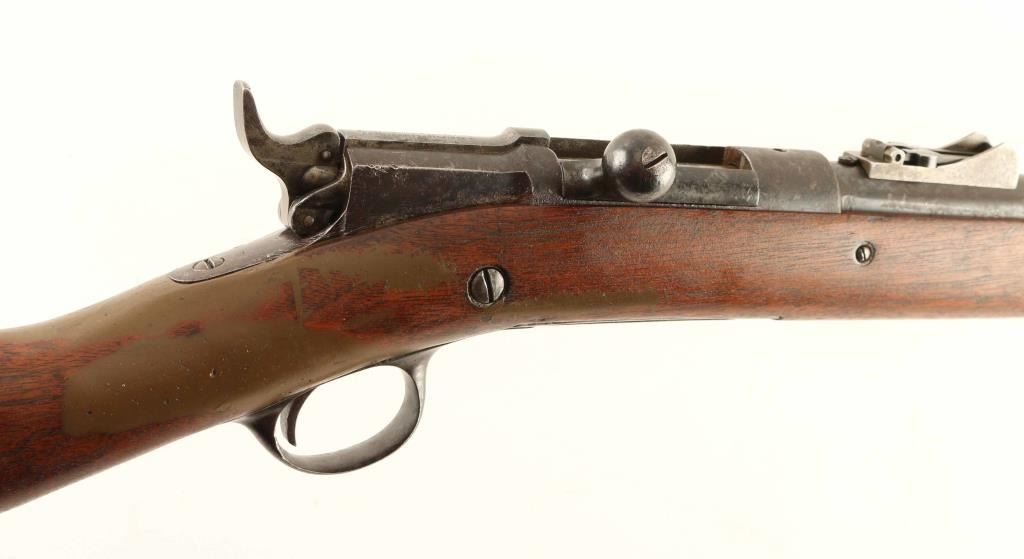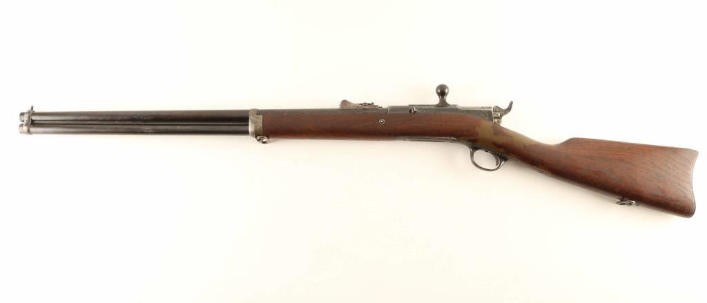Bolt action rifle manufactured circa 1880 - 1886. Features blued finish, half length wood stock, slightly curved steel buttplate, 25" barrel, magazine tube under barrel, blade front sight, flip-up elevator rear sight, sling swivels, magazine cutoff, external hammer. Bore is very good condition. Retains 70% blued finish, turning plum with early patina on barrel, mag tube & bottom metal, pitted and dark on receiver. Bolt body and hammer appear originally case hardened, now a dull mottled gray and brown with small areas of patina. Rear band is smooth light gray color with several spots of brown patina. Sharp edges of receiver have small sharp dents in several places. Wood is serviceable, mostly good condition with repair at wrist, appears to be an epoxy type filler material, repair appears smooth and follows lines of stock. Markings are crisp and readable. Condition is NRA Fine *** Antique Firearm ***