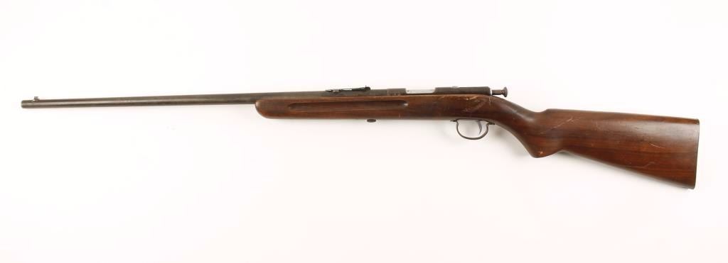 Single shot bolt-action sporting rifle chambered in .22 caliber, circa 1935. Features a blued 24" barrel, front blade sight, adjustable rear sporting sight, bent bolt handle, checked firing pin head and a one piece American walnut shoulder stock with grooved forend & metal buttplate. Finish has worn to a mostly even grey patina. Action is smooth, bore is very good and stock is good with the moderate dings and mars. Condition is near good. ***C&R Firearm*** ***Modern Firearm***