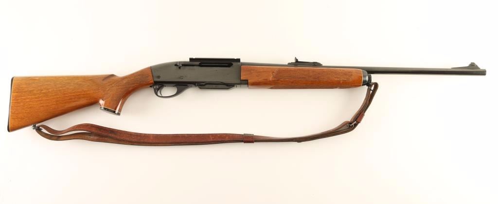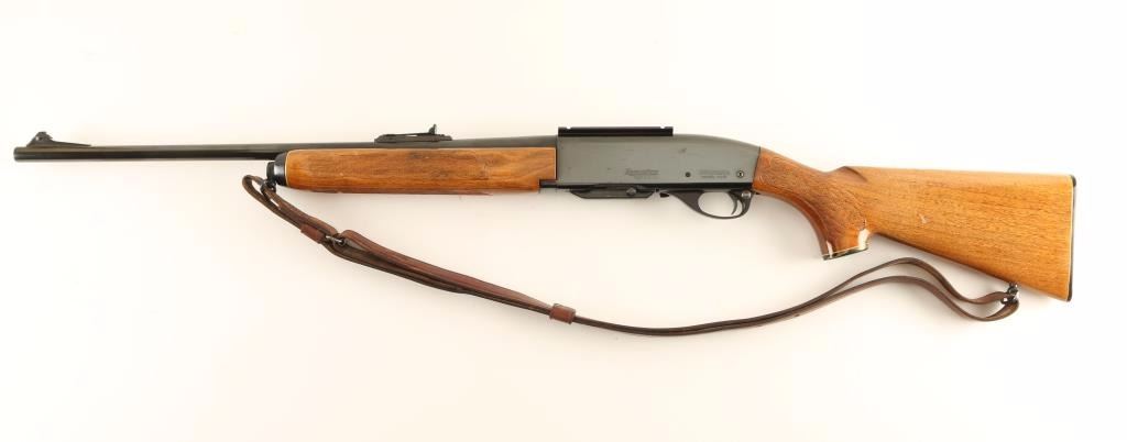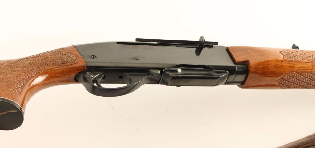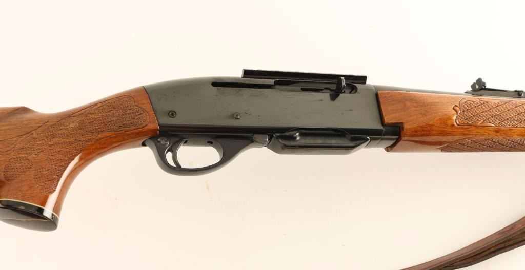 'Woodsmaster' Magazine-fed semi-automatic sporting rifle chambered in .30-06 Springfield. Features a blued finish, 22" barrel, ramped blade front sight, adjustable rear sporting sight, installed scope base, 4 round detachable magazine, push button safety, beveled trigger, Hunter smooth brown leather sling, fancy checkered walnut forend and pistol grip shoulder stock with black grip cap & factory checkered black plastic buttplate. Rifle retains approximately 90% of it's original blued finish showing some light scratches/handling marks along with a few small scattered losses. Action is crisp, bore is very good and wood stocks are very good with several light scrapes & dings. Condition is very good. ***Modern Firearm***
