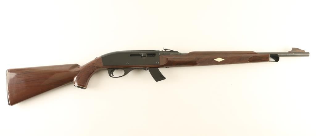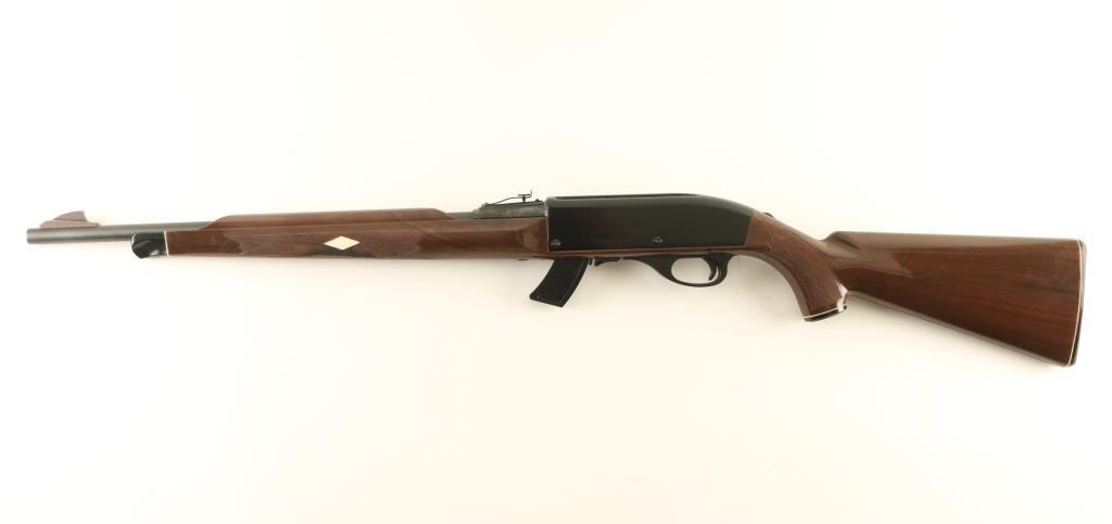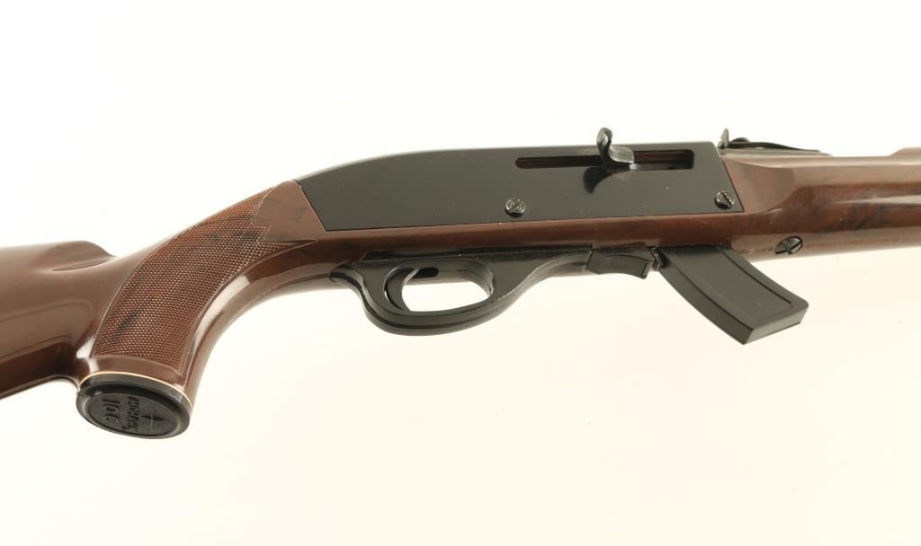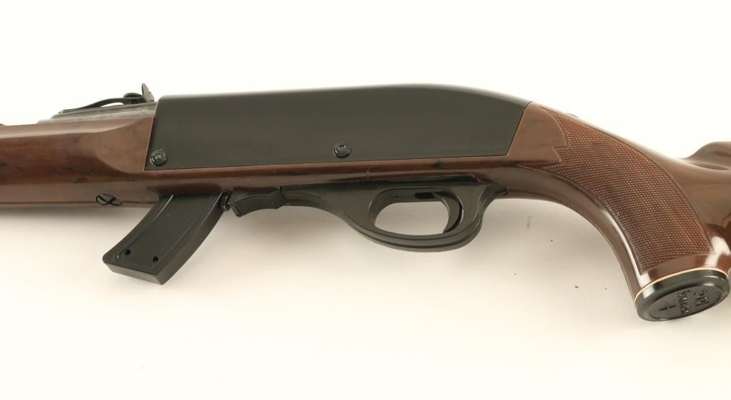 Rifle. Semi-Automatic. "Mohawk". Produced 1959-1987. Blued steel barrel. black painted receiver. , Brown polymer stock. 19.5" barrel with adjustable notch sights. Receiver grooved for scope mount. Fed from a 14 rd box magazine. Bore is excellent, with some minor sctraches. Action is smooth. Finish is excellent except for some minor spotting on the right upper barrel. NRA Condition-Very Good. Modern Firearm.