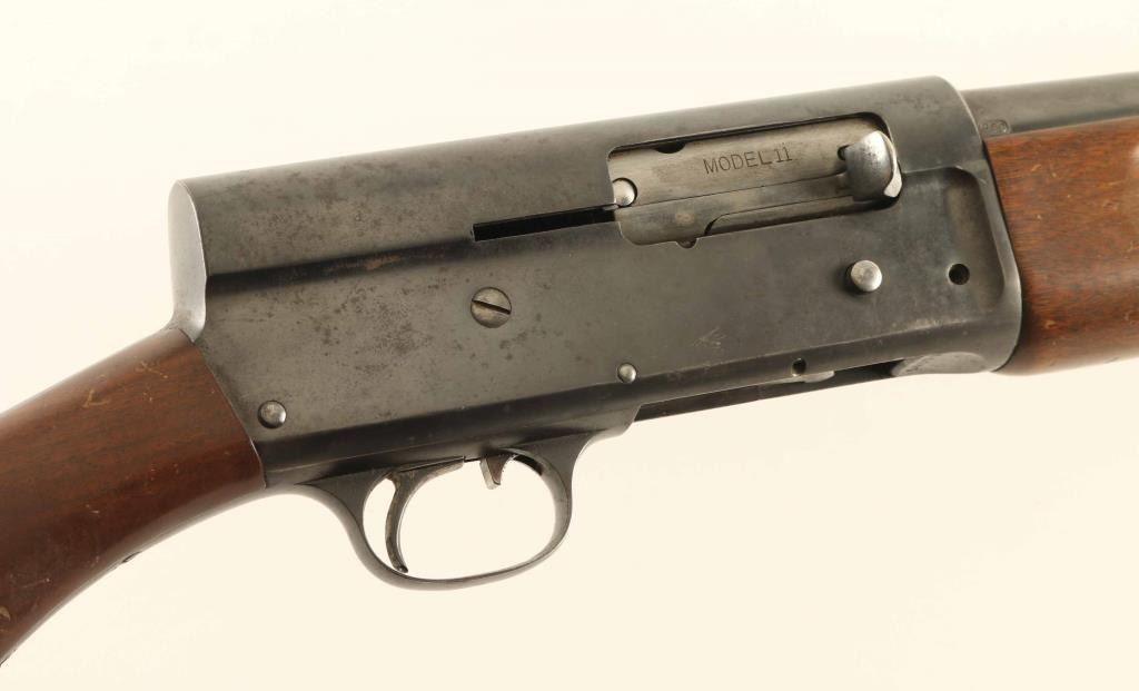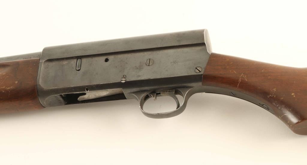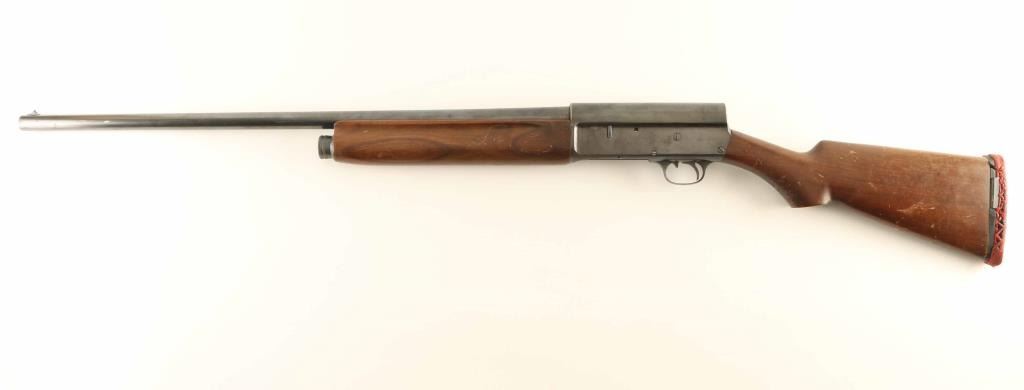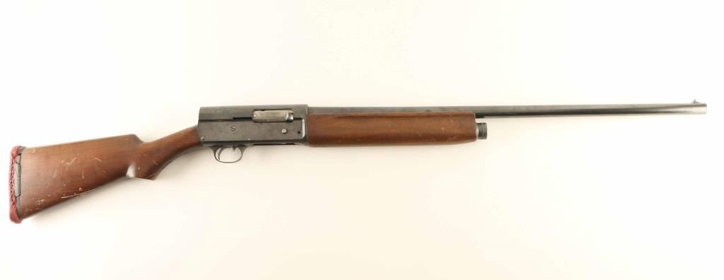 Semiautomatic shotgun accepts 2-3/4" shells. Features blued finish, plain wood forend, plain wood stock with curved grip, recoil pad, 28" plain barrel (marked FULL, measures IM with gauge), steel front bead, manual safety inside triggerguard. Bore is excellent. Retains 70% blue with scuffs & scrapes, scattered light pitting on receiver, bare metal on sharp edges. Wood is good condition with many scratches and dents, especially on butt. Recoil pad is broken and misshapen, need replaced. Condition is NRA Good + *** C&R Firearm ***