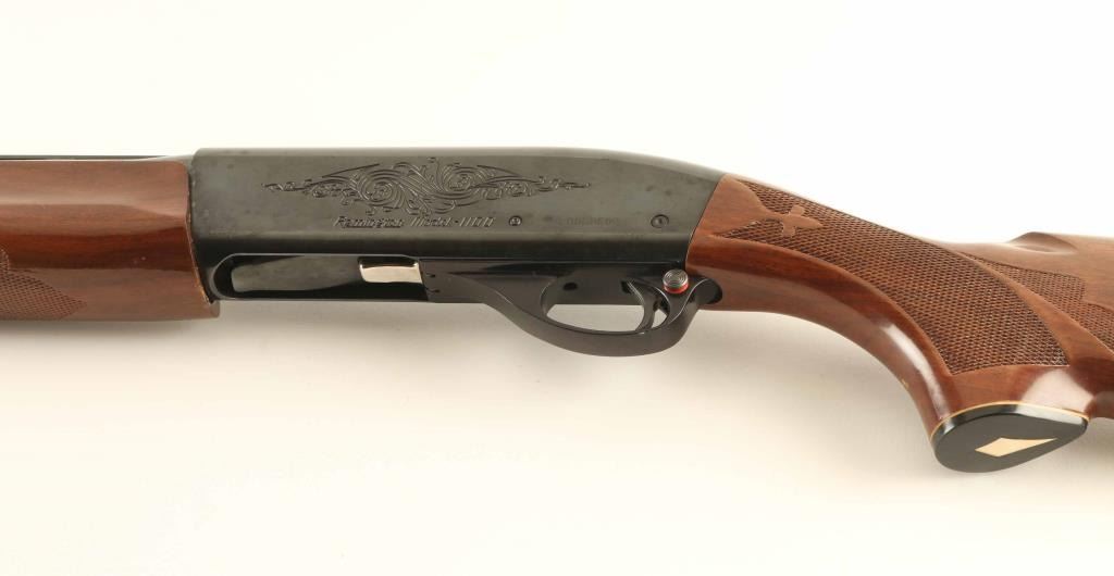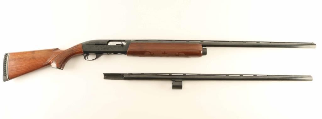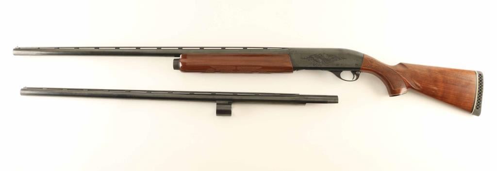 Semiautomatic shotgun accepts 2-3/4" shells. Features blued finish, checkered wood forend, wood stock with curved grip & checkered wrist, ventilated rubber recoil pad, 30" vent rib barrel, steel front bead, manual safety. Receiver is roll engraved on both sides with floral scroll pattern. Right side of receiver marked "MAGNUM". Bore is very good condition. Retains 85% blue with scratches & scrapes on barrel & receiver. Wood is very good condition with few scratches and scrapes. Includes additional magnum (3" shells) barrel: 30" vent rib, fixed FULL choke, steel front bead, very good bore, 80% blue with some light surface rust, dents to rib. Condition is NRA Very Good *** Modern Firearm ***