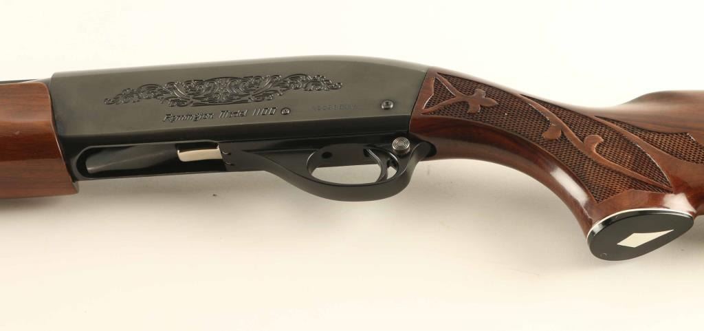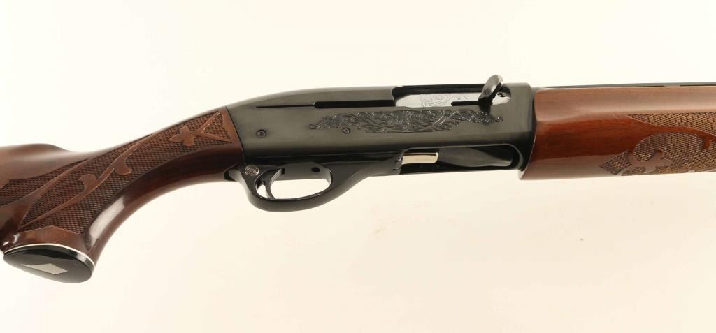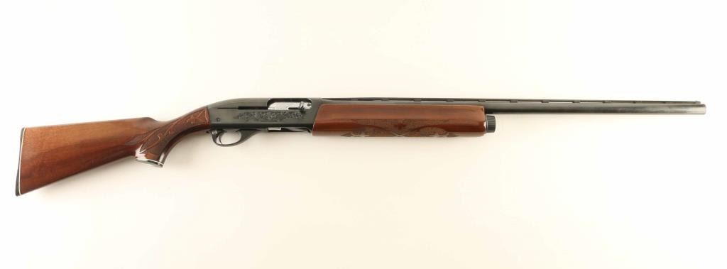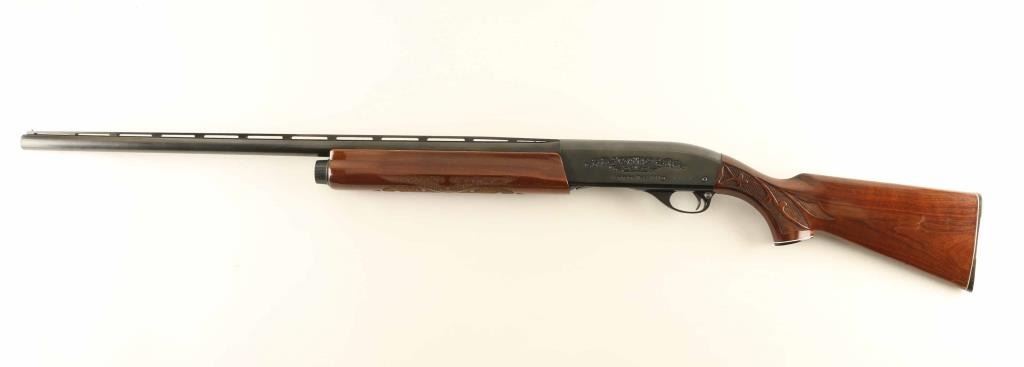 Semiautomatic shotgun accepts 2-3/4" shells. Features 28" vent rib barrel, fixed MOD choke, steel front bead, manual safety, blued finish, engraved receiver, urethane finished wood butt & forend, checkering panels at wrist and forend, plastic butt plate. Engraving features a large floral scroll on each side of receiver, smaller matching scroll on exposed side of bolt. Bore is excellent condition. Metal retains 95% finish with signs of handling and use. Wood is very good overall condition with scratches and small dents, several small raised blisters on butt near buttplate. Condition is NRA Very Good+ *** Modern Firearm ***