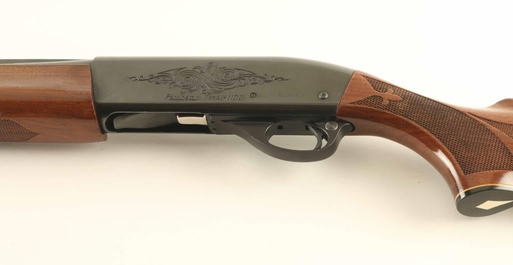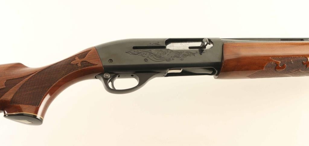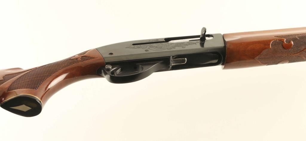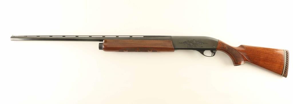 Semiautomatic shotgun features blued finish, engraved receiver, urethane finished wood forend & stock with fancy fleur-de-lis pattern checkering on forend & wrist, ventilated rubber recoil pad, 28" vent rib barrel, steel front bead, fixed full choke, manual safety. Accepts 2-3/4" or shorter shells. Bore is very good condition. Retains 90% blue with scratches on receiver, handling marks. Stock is near excellent with some shallow small dents. Condition is NRA Very Good ++ *** Modern Firearm ***