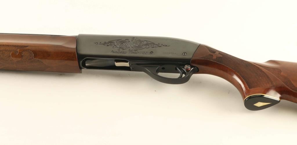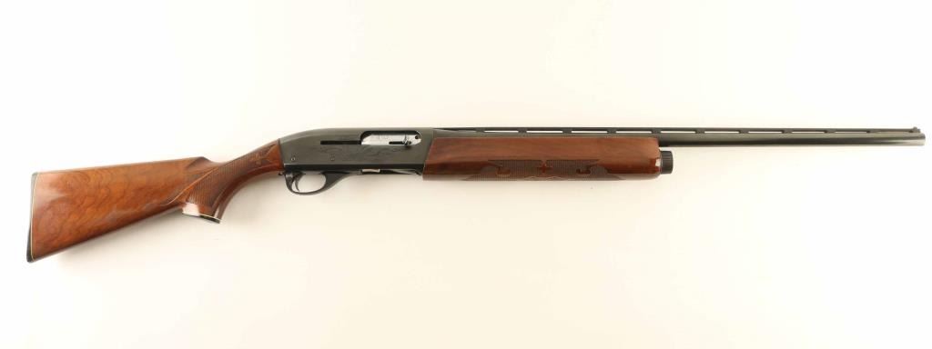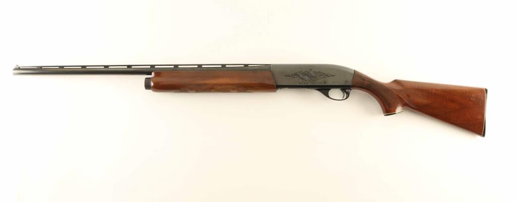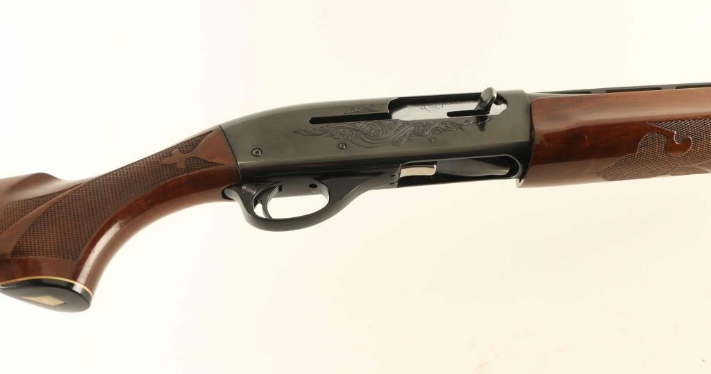 Semiautomatic shotgun accepts 2-3/4" shells. Features 25.5" vent rib barrel, fixed CYL choke, white polymer front bead, steel mid bead, manual safety, blued finish, engraved receiver, urethane finished wood butt & forend, checkering panels at wrist and forend, plastic butt plate. Engraving features a large floral scroll on each side of receiver, smaller matching scroll on exposed side of bolt. Bore is excellent condition. Metal retains 90% finish with signs of handling and use, bare metal on sharp edges. Wood is very good or better with scratches and small dents. Condition is NRA Very Good+ *** Modern Firearm ***