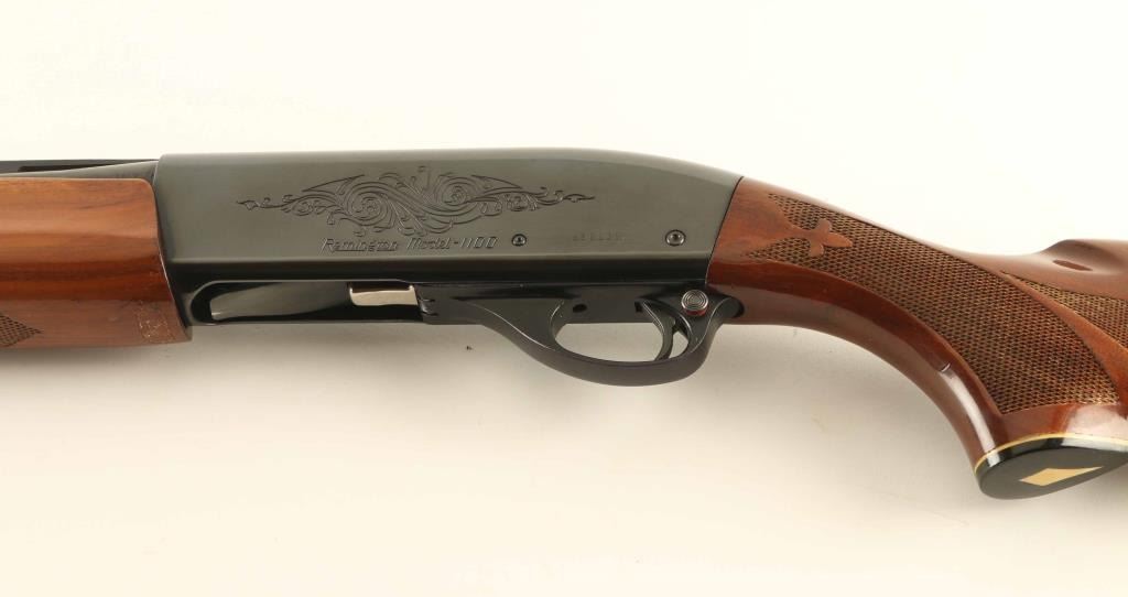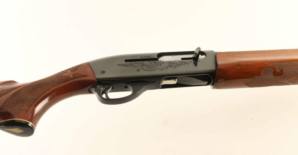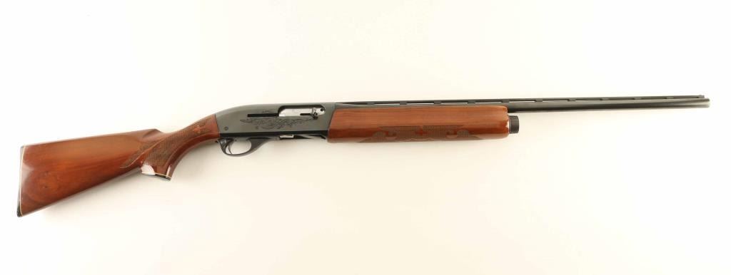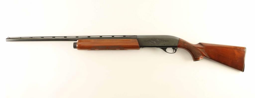 Semiautomatic shotgun accepts 2-3/4" or shorter shells. Features 26" vent rib barrel, fixed CYL choke, steel front bead, manual safety, blued finish, engraved receiver, urethane finished wood butt & forend, checkering panels at wrist and forend, plastic butt plate. Engraving features a large floral scroll on each side of receiver, smaller matching scroll on exposed side of bolt. Bore is excellent condition. Metal retains 95% finish with signs of handling and use. Wood is very good or better with scratches and small dents. Condition is NRA Excellent *** Modern Firearm ***