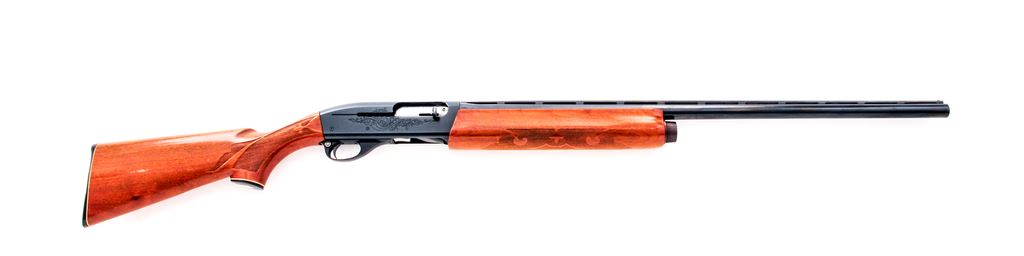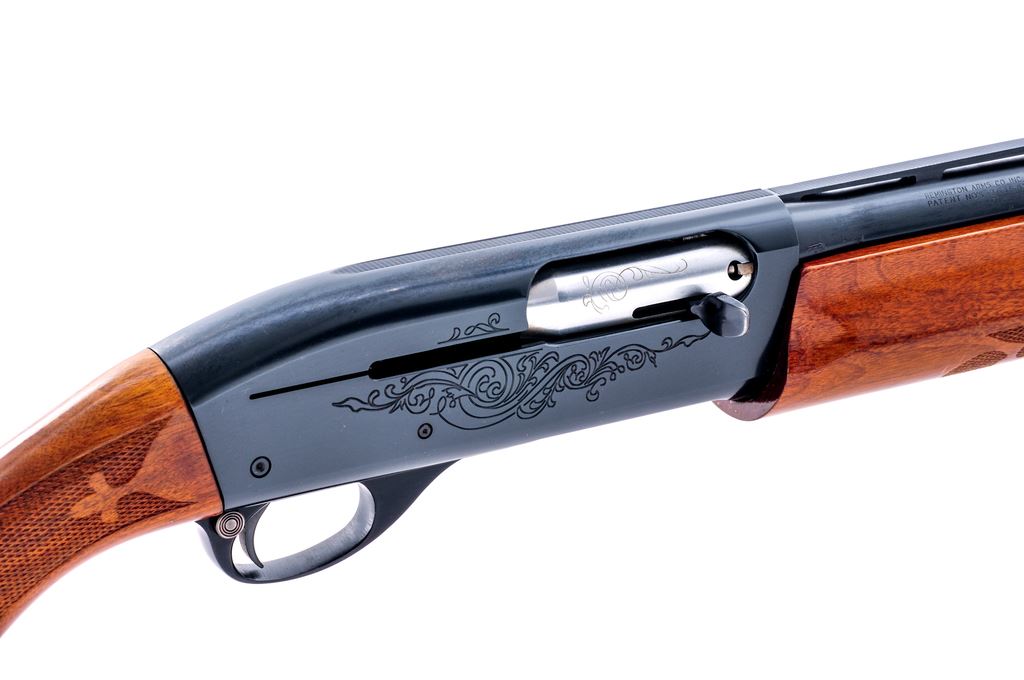 Remington Model 1100 Semi-Automatic Shotgun, #484559V, 12 ga., 2-3/4'' chamber, 28'' vent rib barrel with silver bead front sight, choked Full, blue finish, receiver with standard light engraving; gloss finished pistol-grip wood stock with press checkering, black composite Remington buttplate, and black grip cap with white diamond center. Metal rates near excellent and retains approx. 98% original blue, showing some normal light marks from field use. Wood rates fine and retains nearly all of its gloss finish, with intermittent shallow impressions and other handling marks; checkering is clean. Action is smooth and tight with an excellent bright bore. Est.: $250-$400. (Modern)
