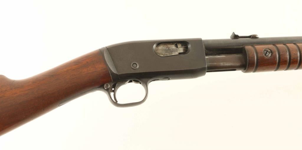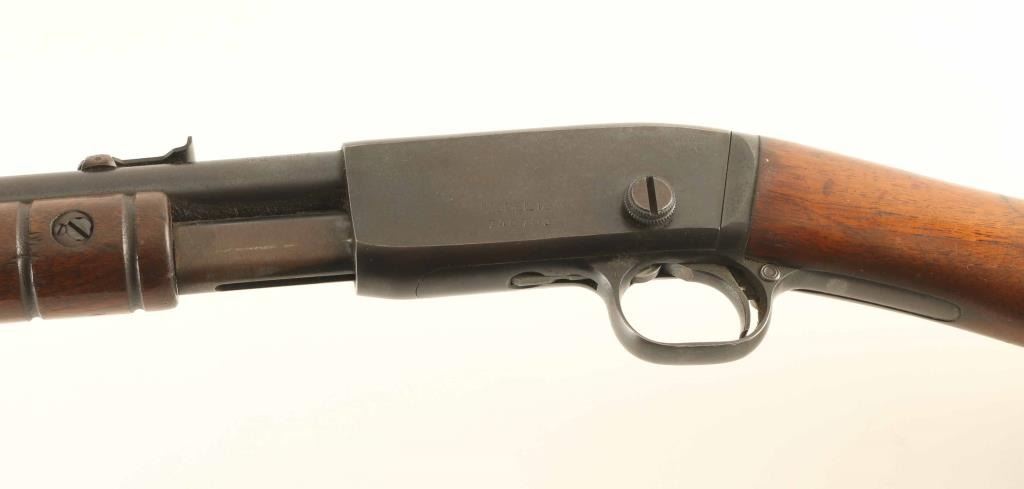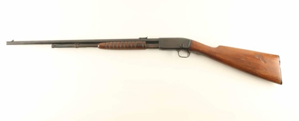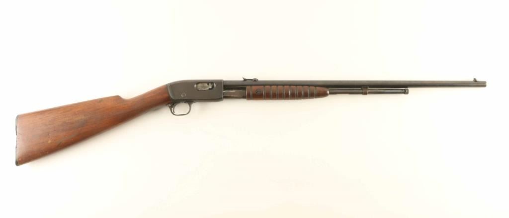 Pump action rimfire rifle features blued finish, wood stock & pump handle, 22" barrel, 2/3 length magazine tube under barrel, adjustable sights, manual safety. Bore is excellent condition. Retains 80% dark bluing, turning slightly brown, with pitting on sides of receiver, bare metal on edges and where action rubs. Wood is good condition, with scratches, areas of discoloration, some loss of finish. Plastic buttplate is broken with several pieces missing. Condition is NRA Good *** C&R Firearm ***