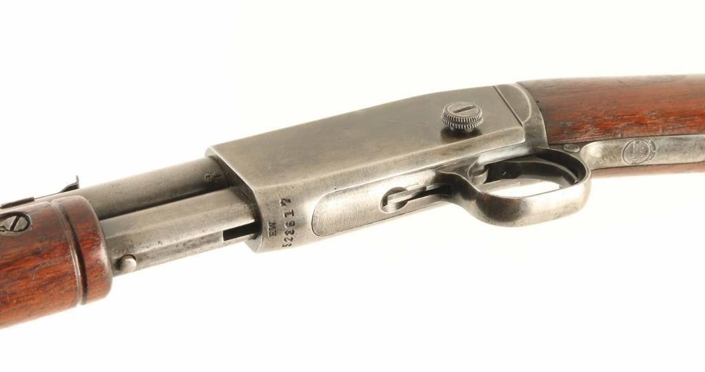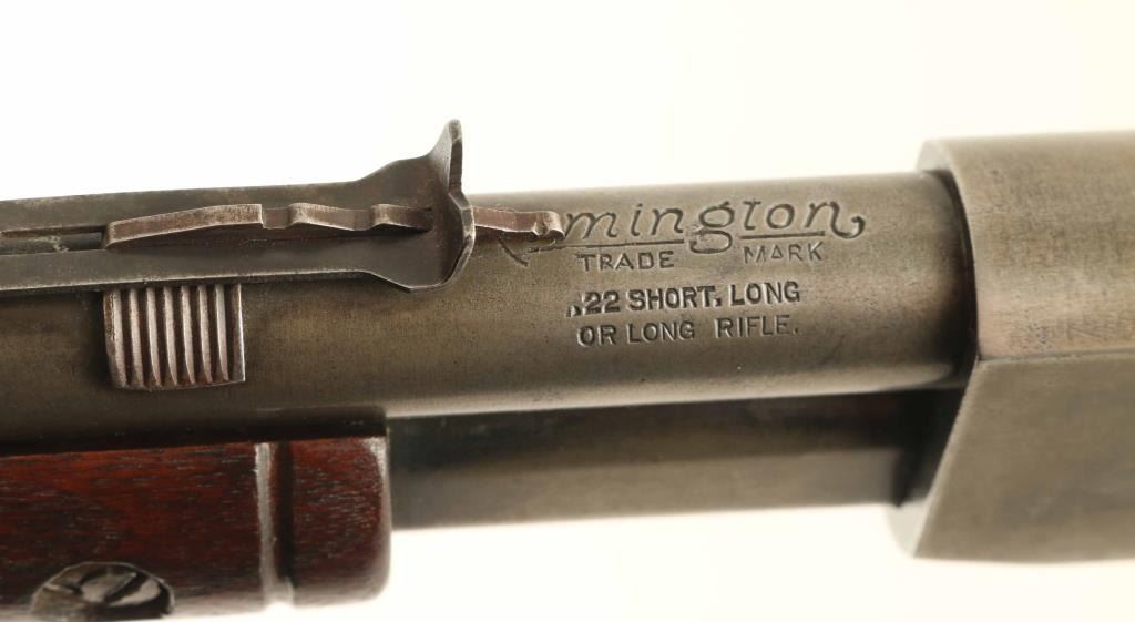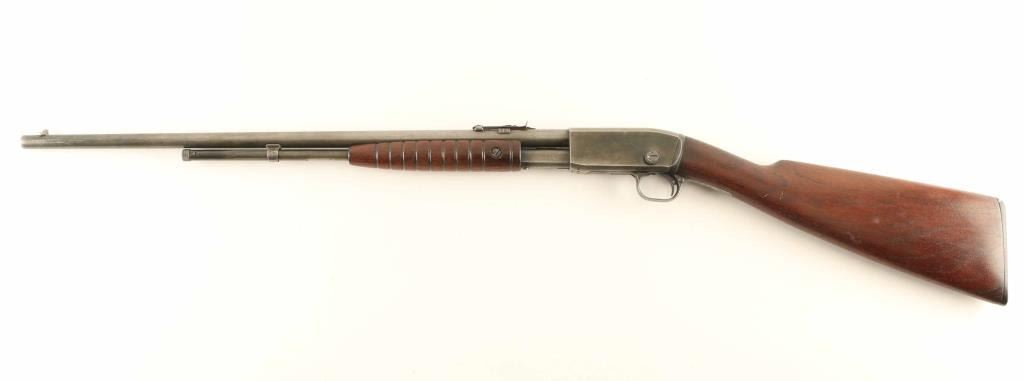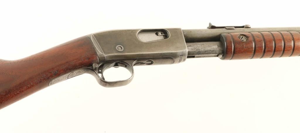 Pump action rimfire rifle features blued finish, wood pump handle and butt, straight grip, flat plastic buttplate, 22" barrel, buckhorn style sights, tube magazine under barrel, manual safety, internal hammer, takedown screw. Bore is fair condition, dark and frosted with partly eroded rifling. Blued surfaces have turned mostly a medium gray color, with streaks or patches of darker gray, thinning or showing bare metal at edges and corners. Barrel markings are crisp. Wood is good to very good condition, appears refinish, coated with dark varnish.. Condition is NRA Good *** C&R Firearm ***
